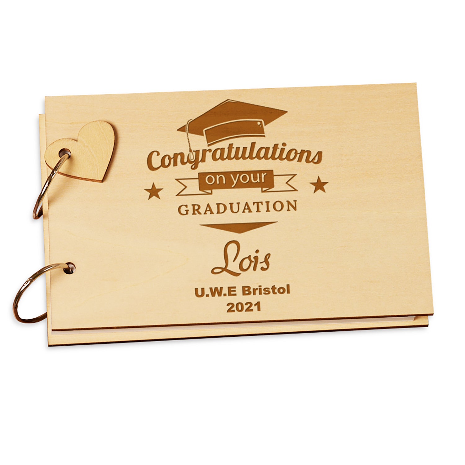 Size: 14.8 x 9.8 cm 30 Pages - More can easily be added. The personalisation is done into the wooden front cover. So in this case we would just need a name other graduation details