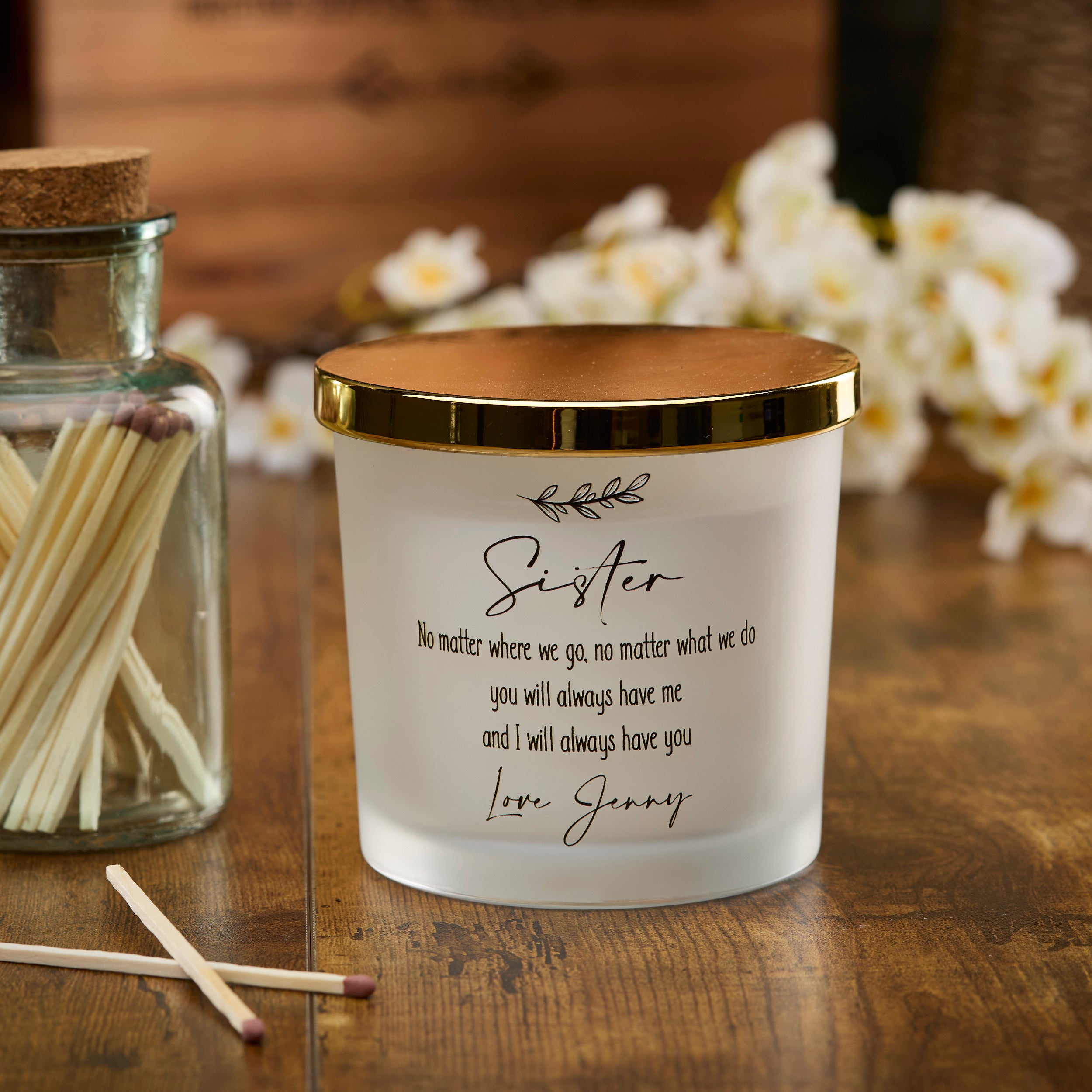 A beautiful candle in with frosted glass, making it ever so special. This lovely candle comes boxed and personalised for that special occasion. The candle measures 10cm x 10cm