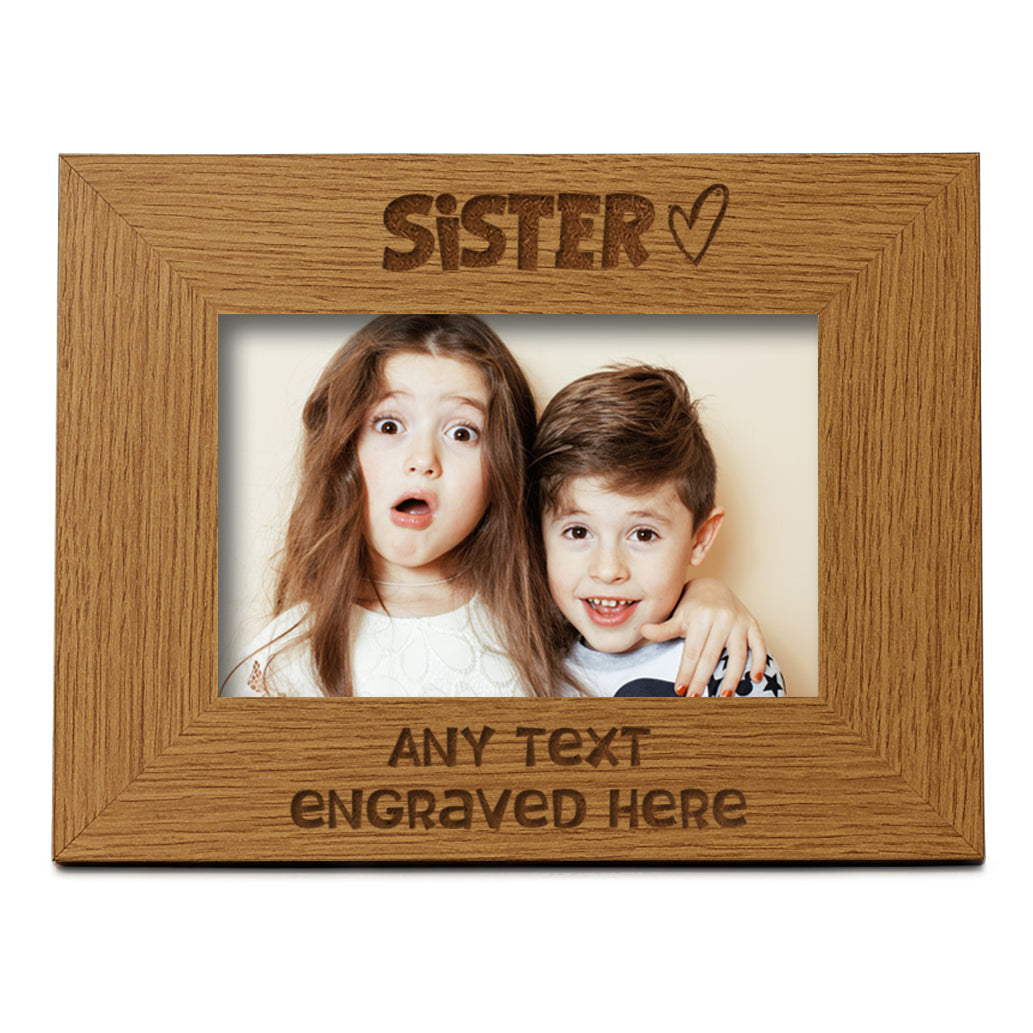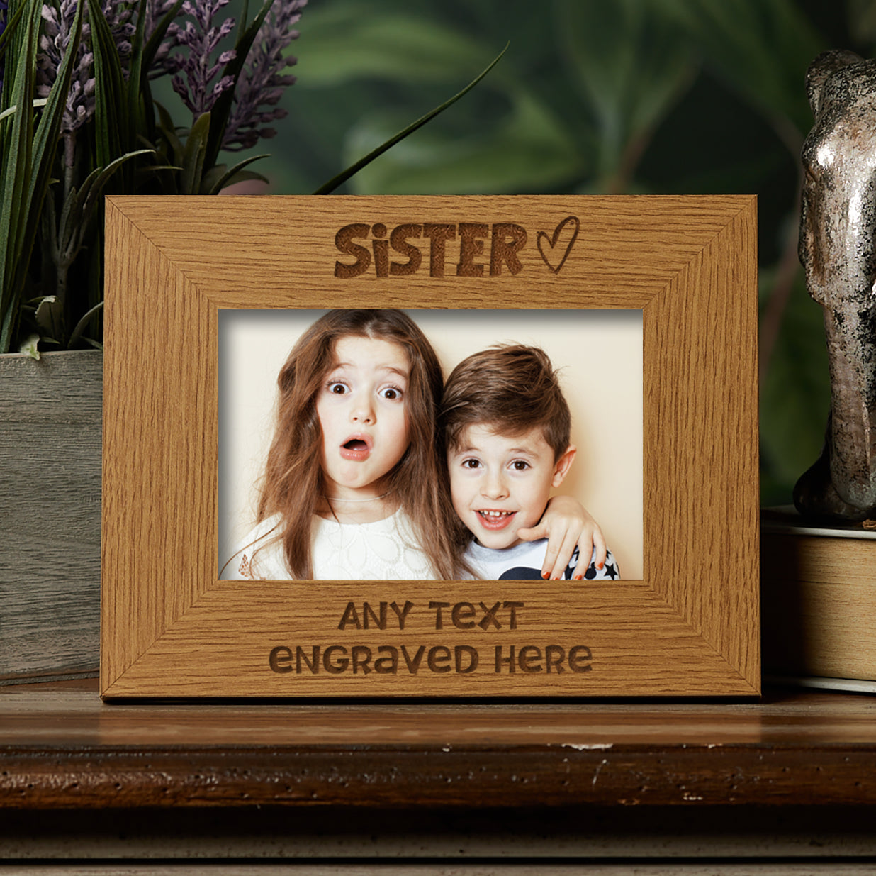 A lovely wooden frame to display that all important or memorable photo .The frame has a oak wood finish with and comes with "Sister" on top and a heart design to the side