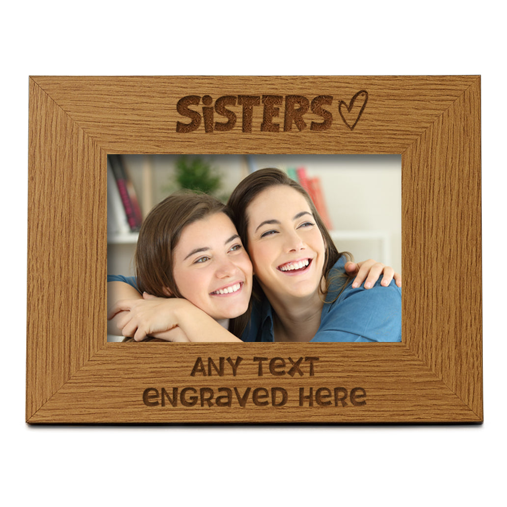 A lovely wooden frame to display that all important or memorable photo .The frame has a oak wood finish with and comes with "Sisters" on top and a heart design to the side