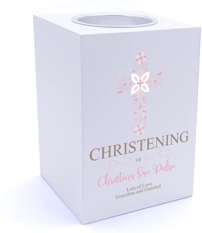 Personalised Christening Pink Ornate Cross Design Tea Light Holder. This gorgeous yet simple tea light holder will...