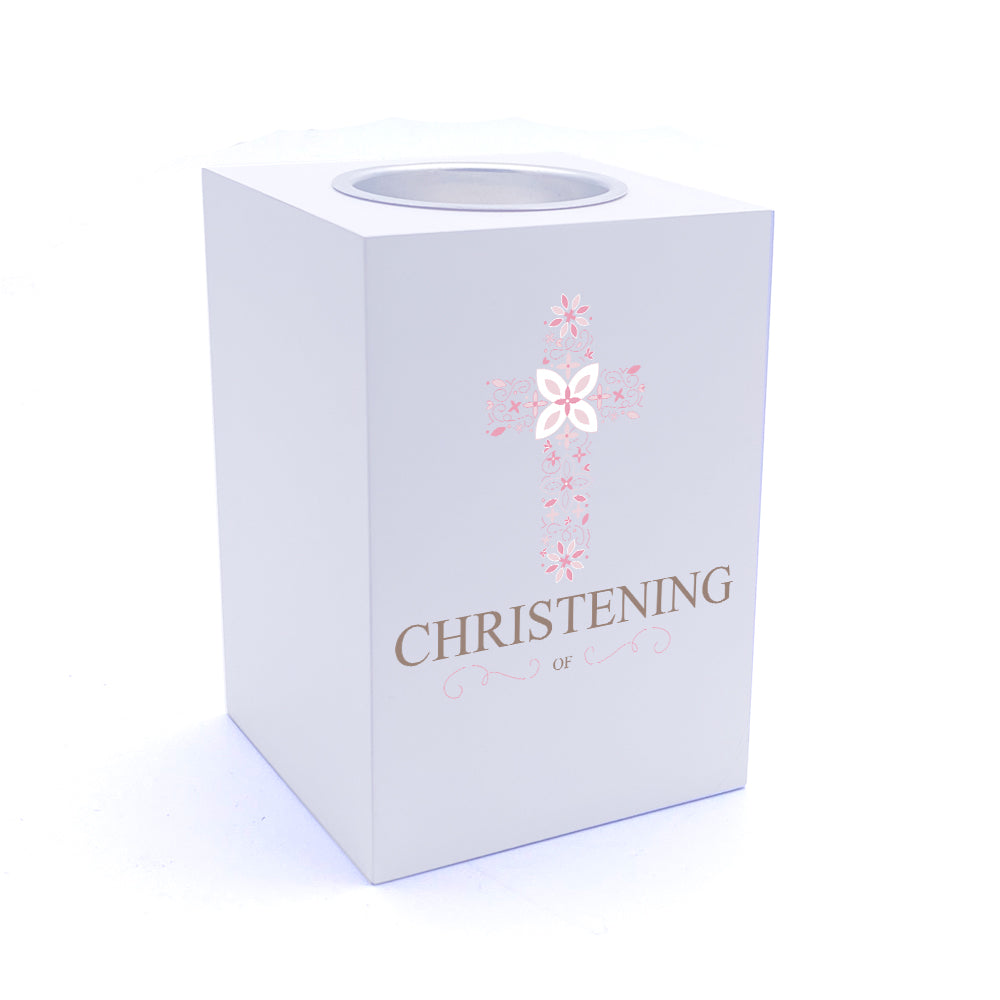 Personalised Christening Pink Ornate Cross Design Tea Light Holder