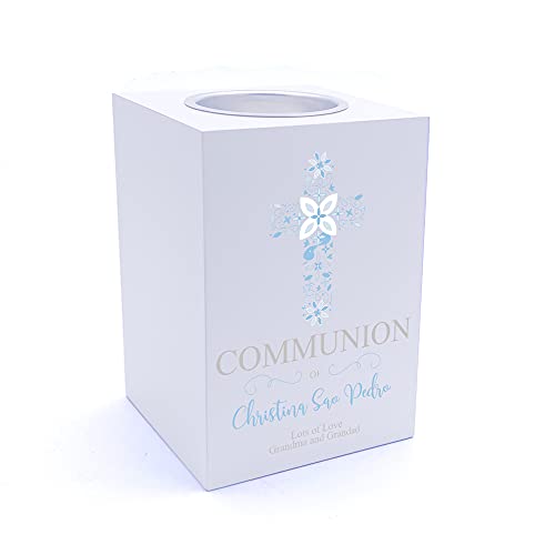 Personalised Communion Blue Ornate Cross Design Tea Light Holder