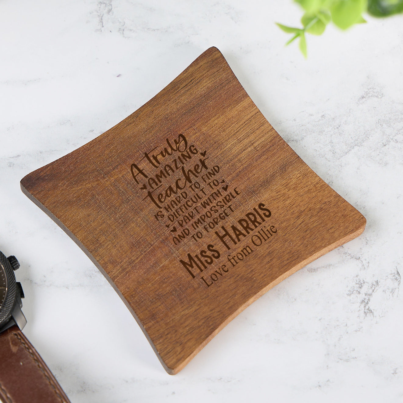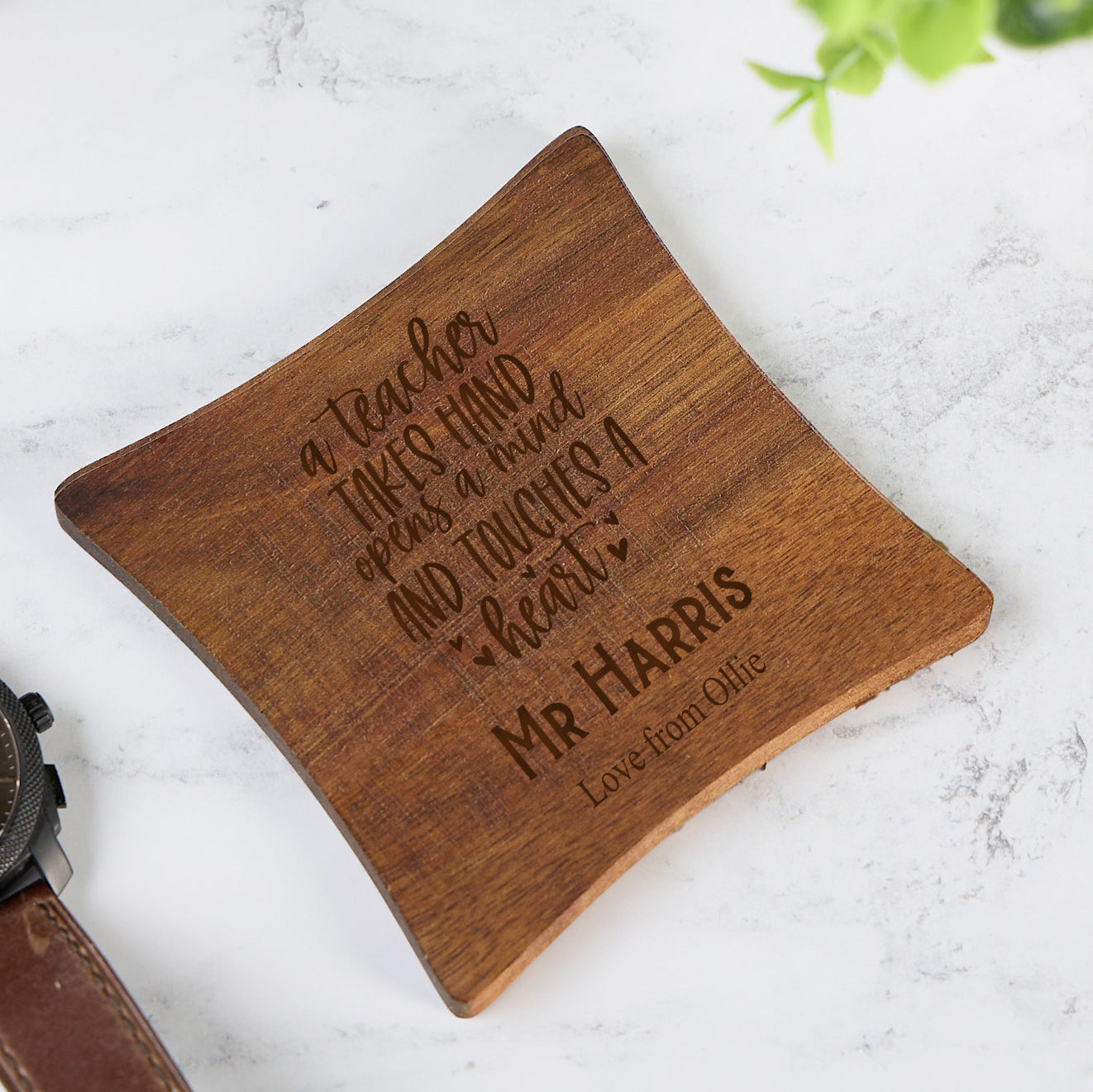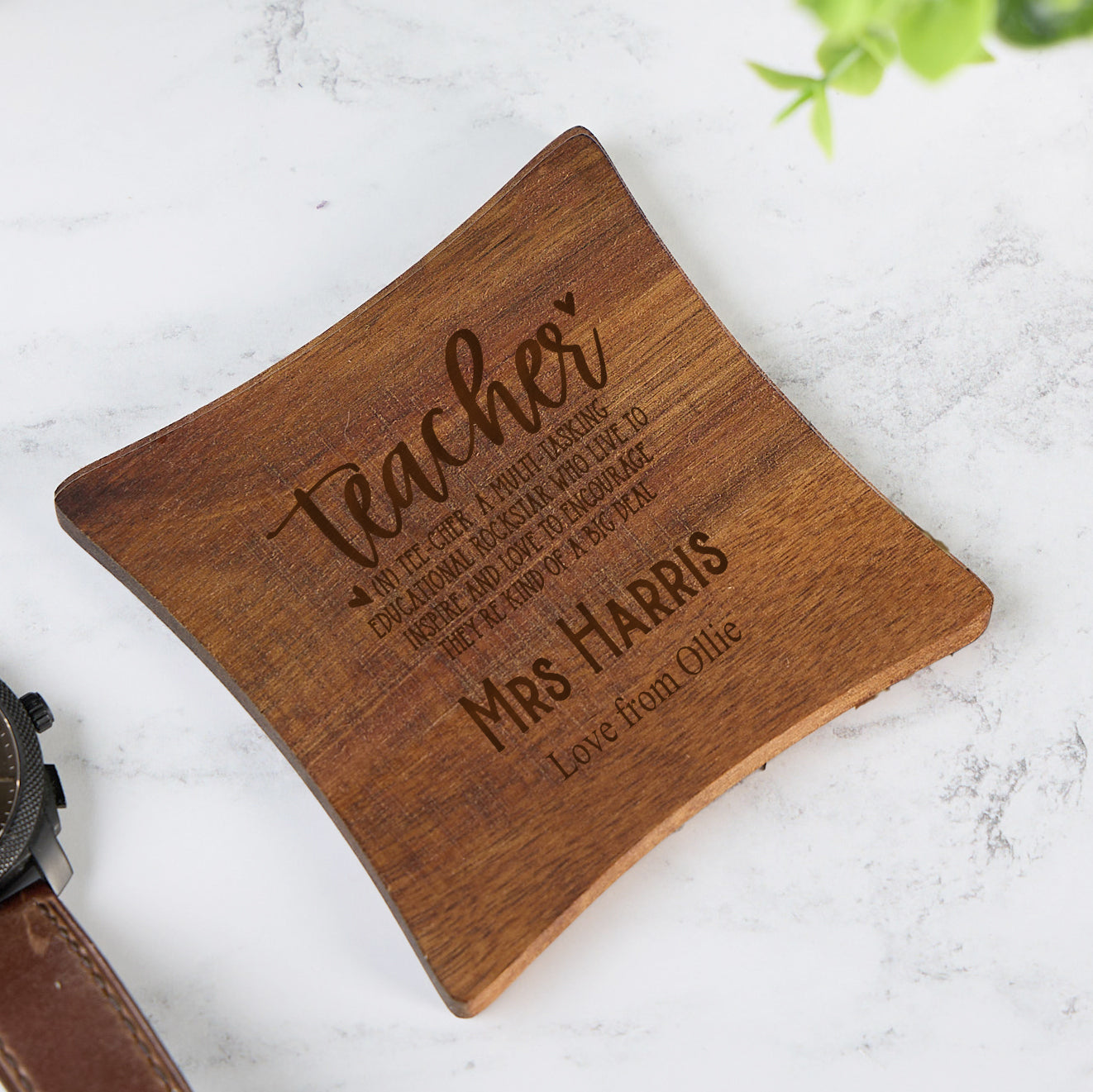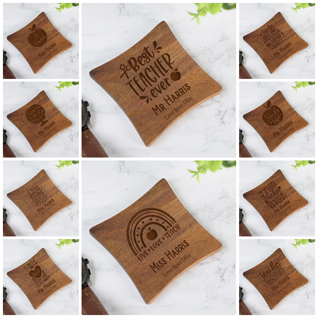 Beautifully handcrafted from durable acacia wood, our personalised coasters are the perfect way to show your appreciation for that special teacher in your life. With a generous size of 10cm, these coasters provide a practical yet elegant solution to protecting surfaces from spills and scratches.