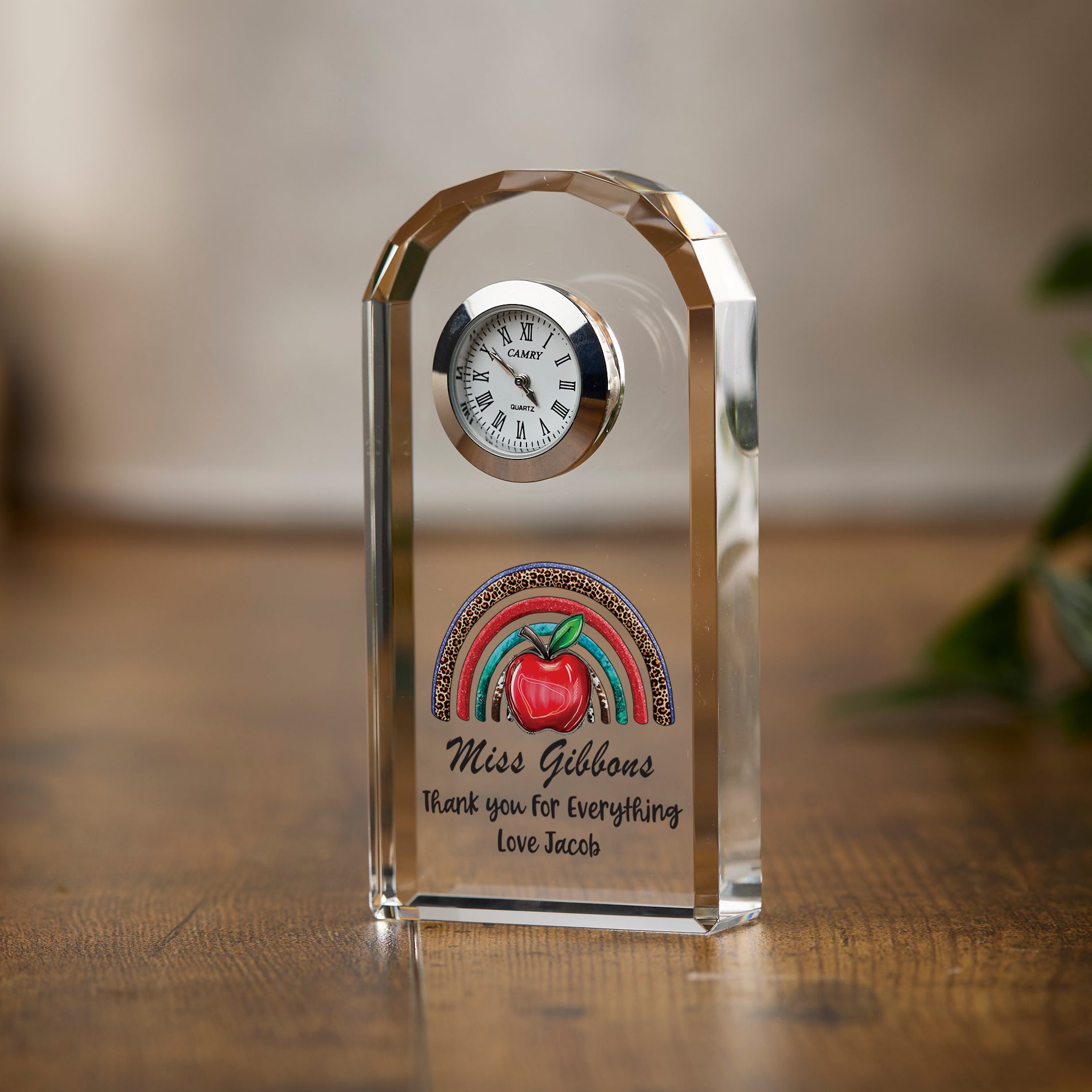 Personalised Teacher Crystal Glass Clock Gift With Apple and Rainbow