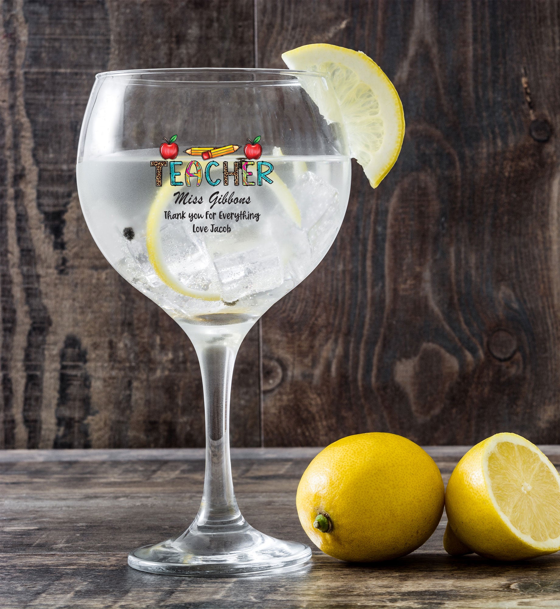 Personalised  Teacher Cocktail Gin Drink Glass Gift With Apples and Pencils