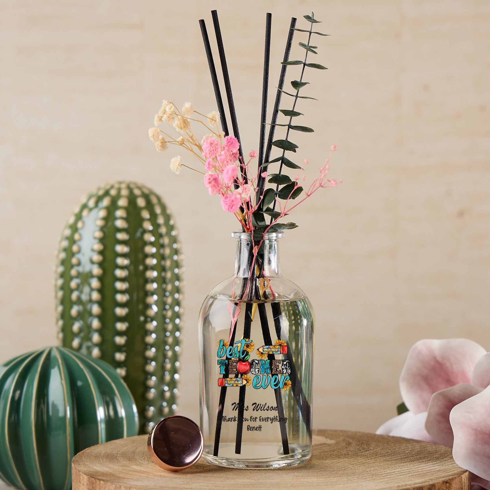 For this exquisite diffuser's personalisation we just need the teachers name: e.g. Miss William and a short sentiment: e.g. Love from Benny