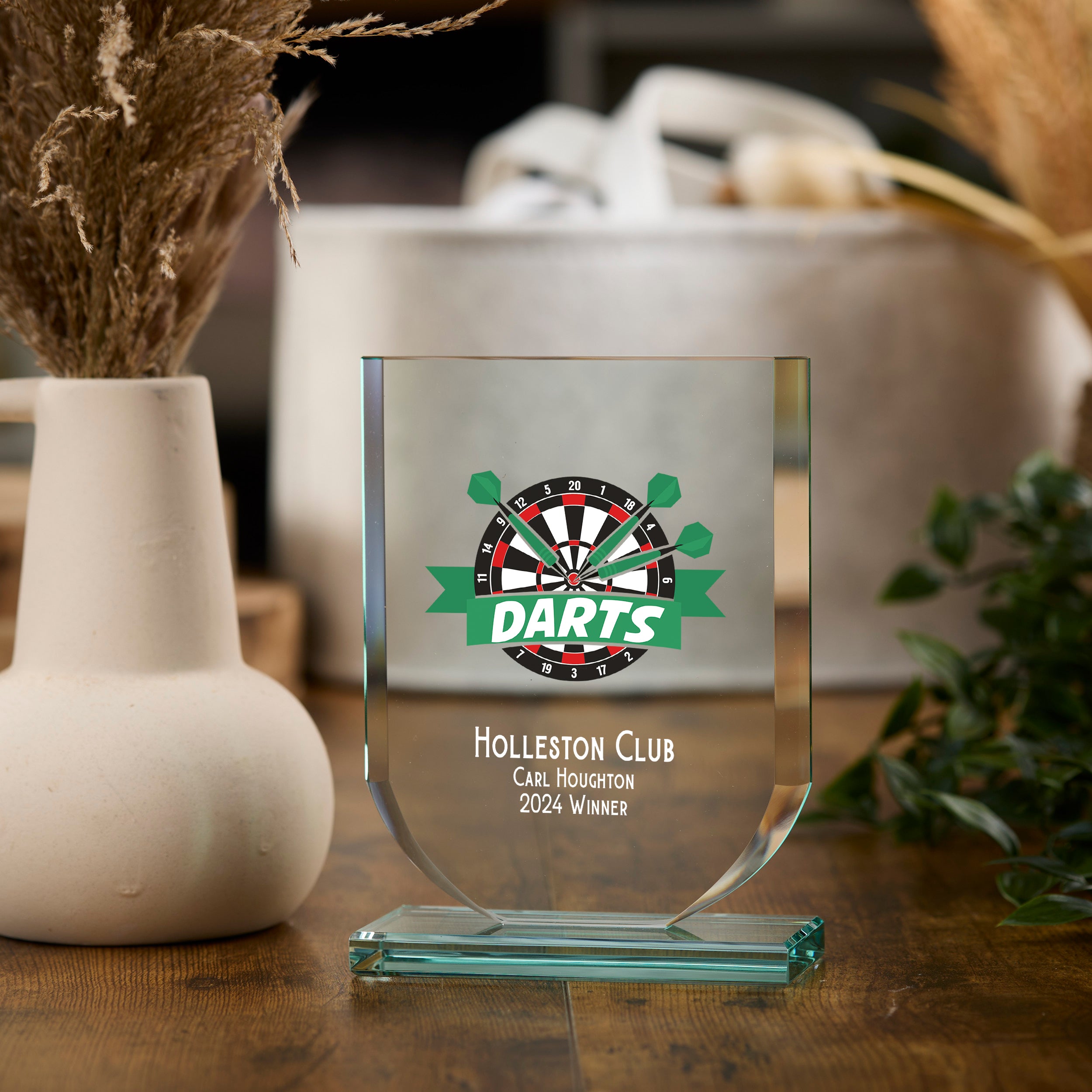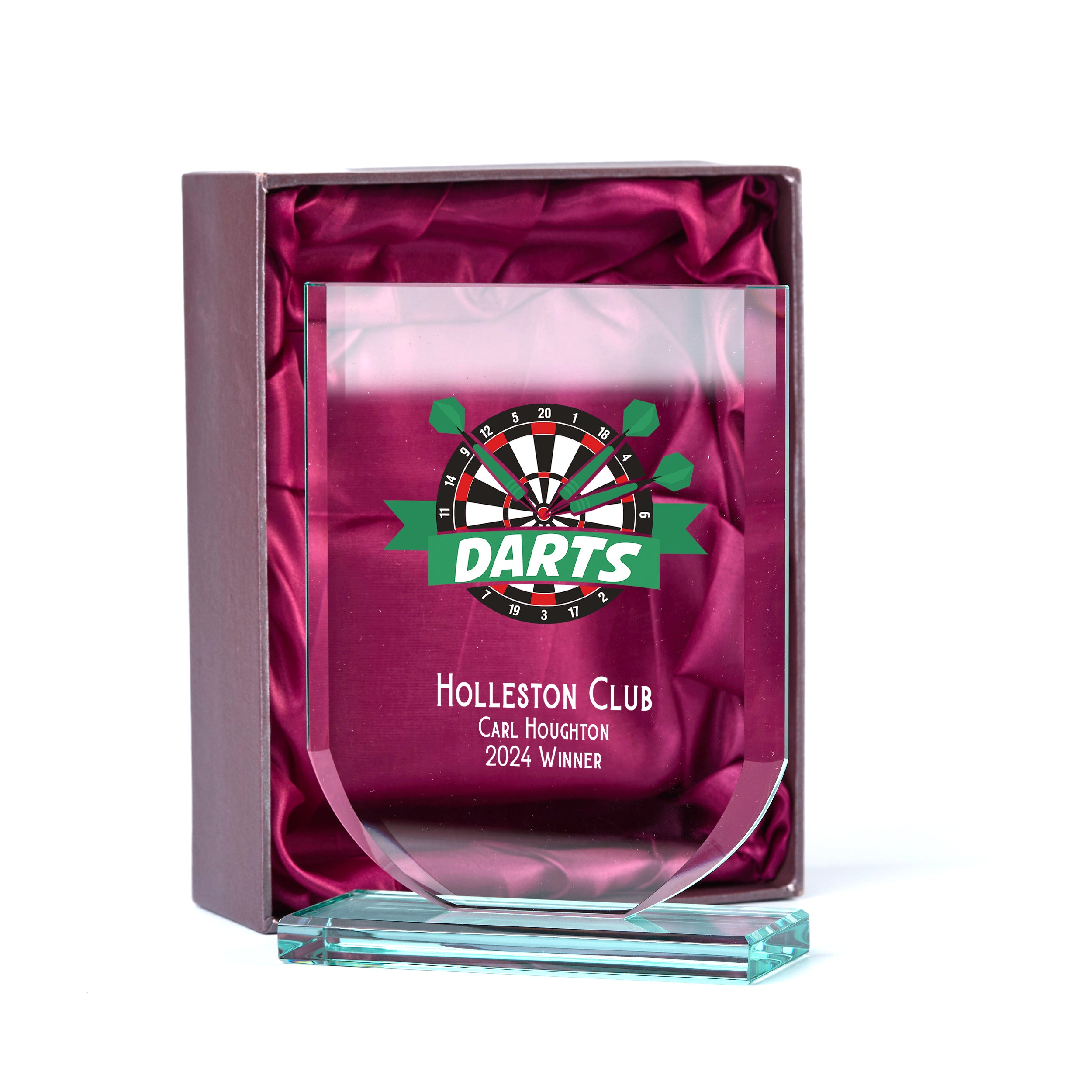 Made from high-quality jade glass, this 15cm Darts trophy is the ideal way to commemorate any special event. Arriving in a luxurious silk-lined gift box, this personalised award is an impressive and thoughtful present. Colour UV Printed ensures that the recipient's achievements will be forever immortalized on this distinguished trophy.