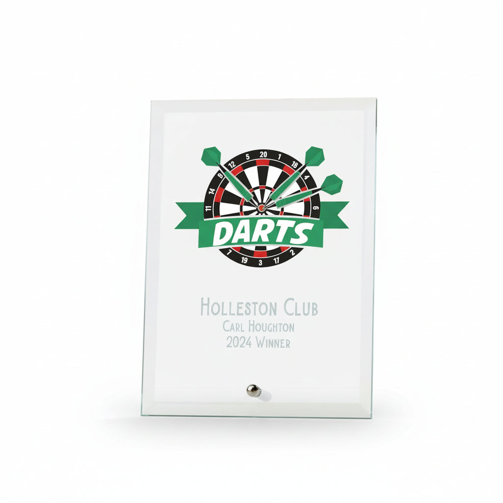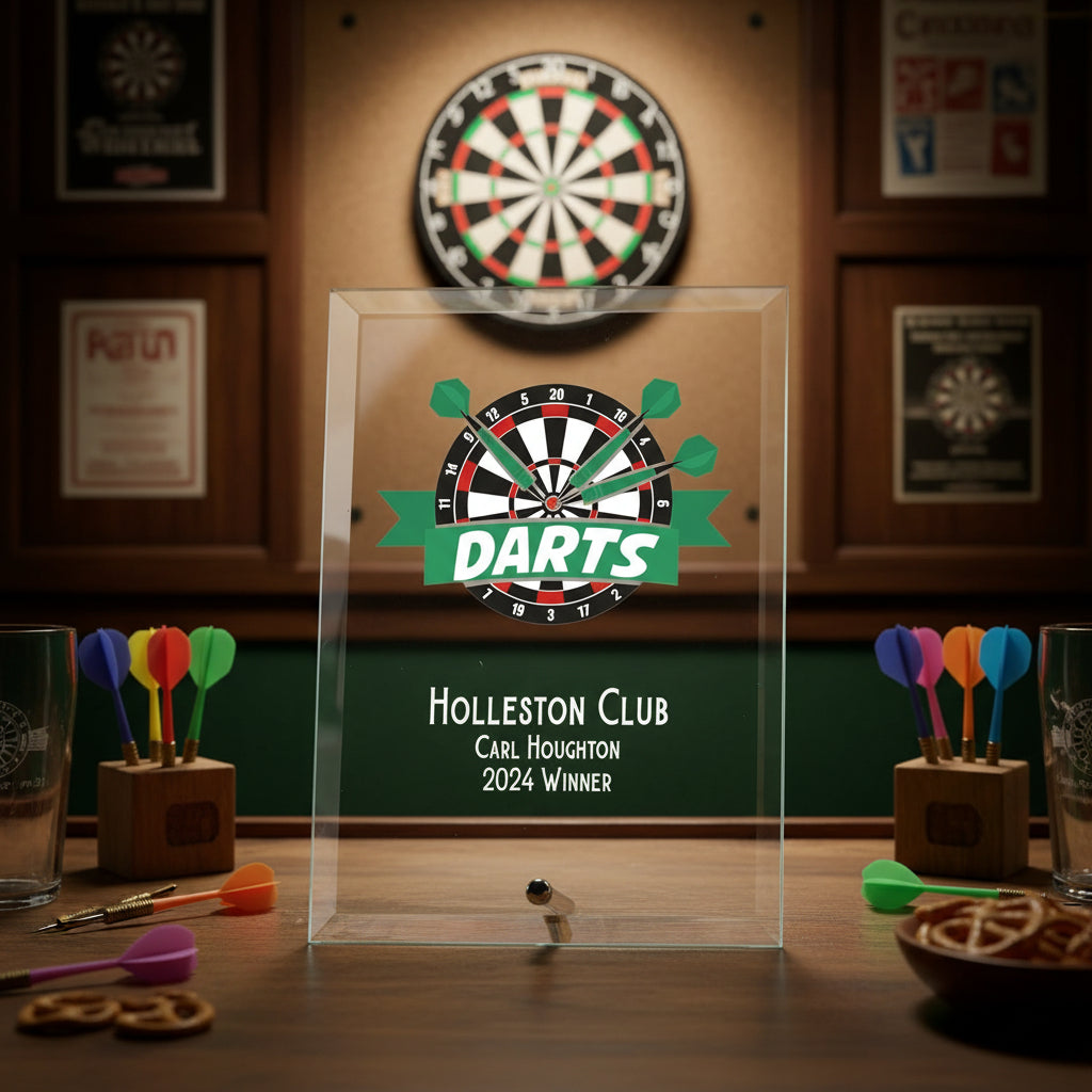 Celebrate competitive excellence with this striking darts trophy plaque, designed to honour achievement in the sport. Featuring a vibrant full-colour print, this personalised keepsake captures the spirit of the game whilst delivering professional-grade recognition that competitors will display with pride. Crafted from premium thick glass, this plaque combines durability with aesthetic appeal. The robust construction ensures it withstands years of display without degradation, making it a genuinely lasting tribute to sporting accomplishment. At 18cm by 13cm, the generous dimensions provide ample space for impactful imagery and personalisation. Whether recognising tournament victories, league champions, or club milestones, this plaque transforms achievement into a tangible memento. The colour printing technique produces sharp, vivid detail that brings darts imagery to life—from action shots to club insignia—creating a bespoke award that feels distinctly personal rather than generic. Ideal for clubs, tournaments, or individual recognition programmes, this trophy plaque motivates continued excellence whilst honouring past success. A meaningful gift that resonates with serious players and casual enthusiasts alike, serving as a permanent reminder of their competitive prowess.