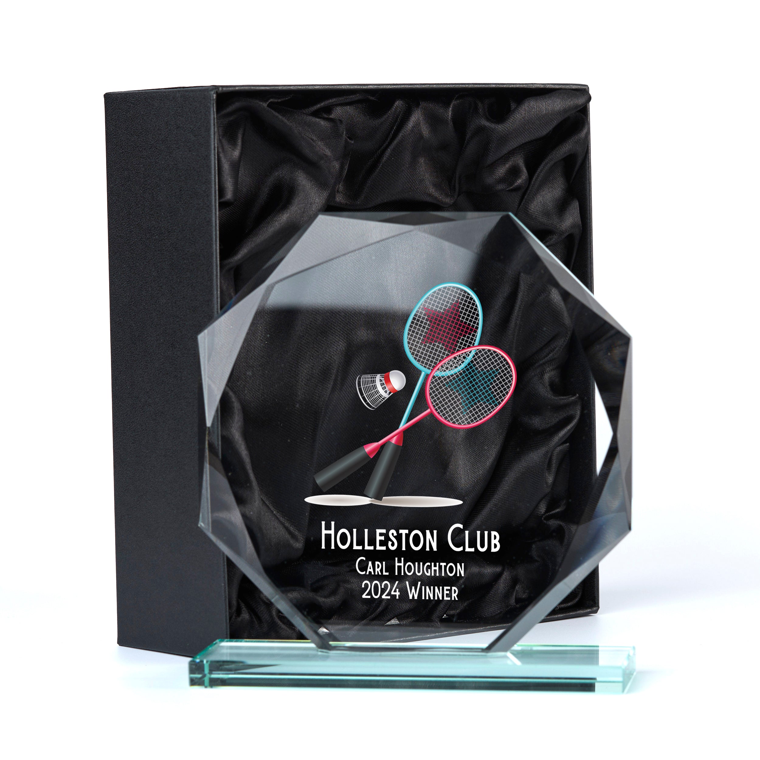 Crafted from high-quality jade glass, this 15cm Badminton icon trophy is the ideal way to commemorate any special event. Arriving in a luxurious silk-lined gift box, this personalised award is an impressive and thoughtful present. Colour UV Printed ensures that the recipient's achievements will be forever immortalized on this distinguished trophy.