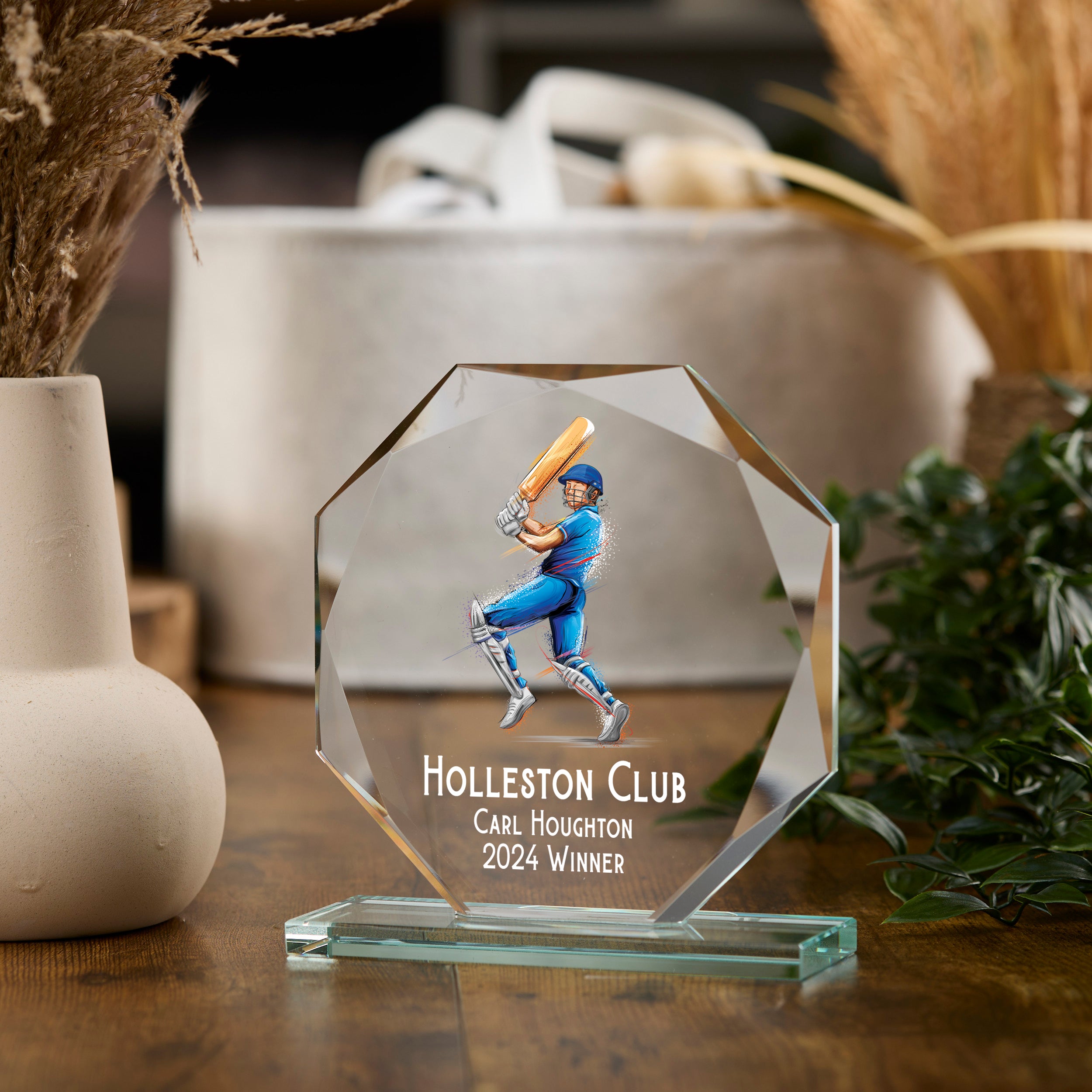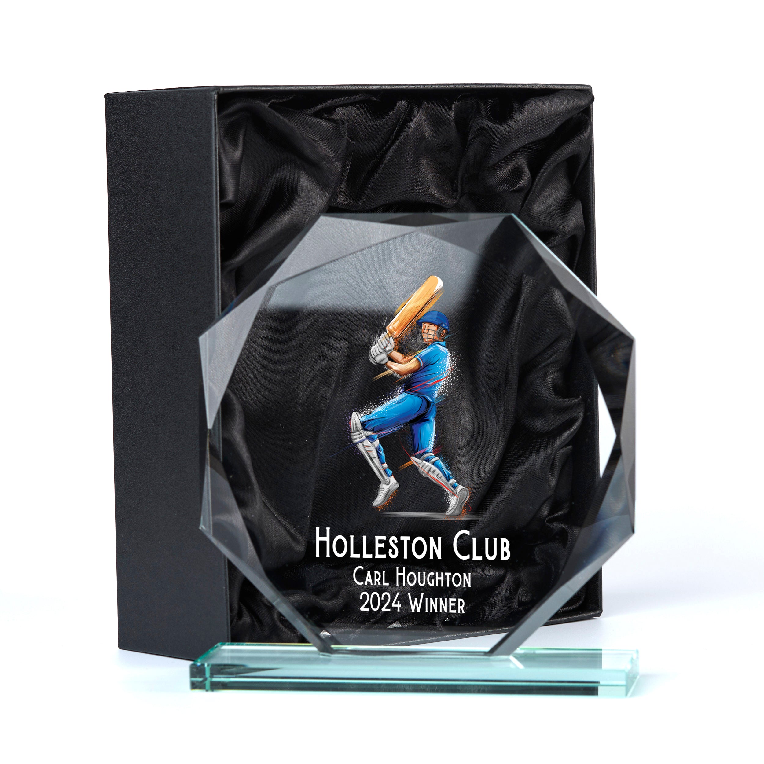 Crafted from high-quality jade glass, this 15cm Cricket icon trophy is the ideal way to commemorate any special event. Arriving in a luxurious silk-lined gift box, this personalised award is an impressive and thoughtful present. Colour UV Printed ensures that the recipient's achievements will be forever immortalized on this distinguished trophy.