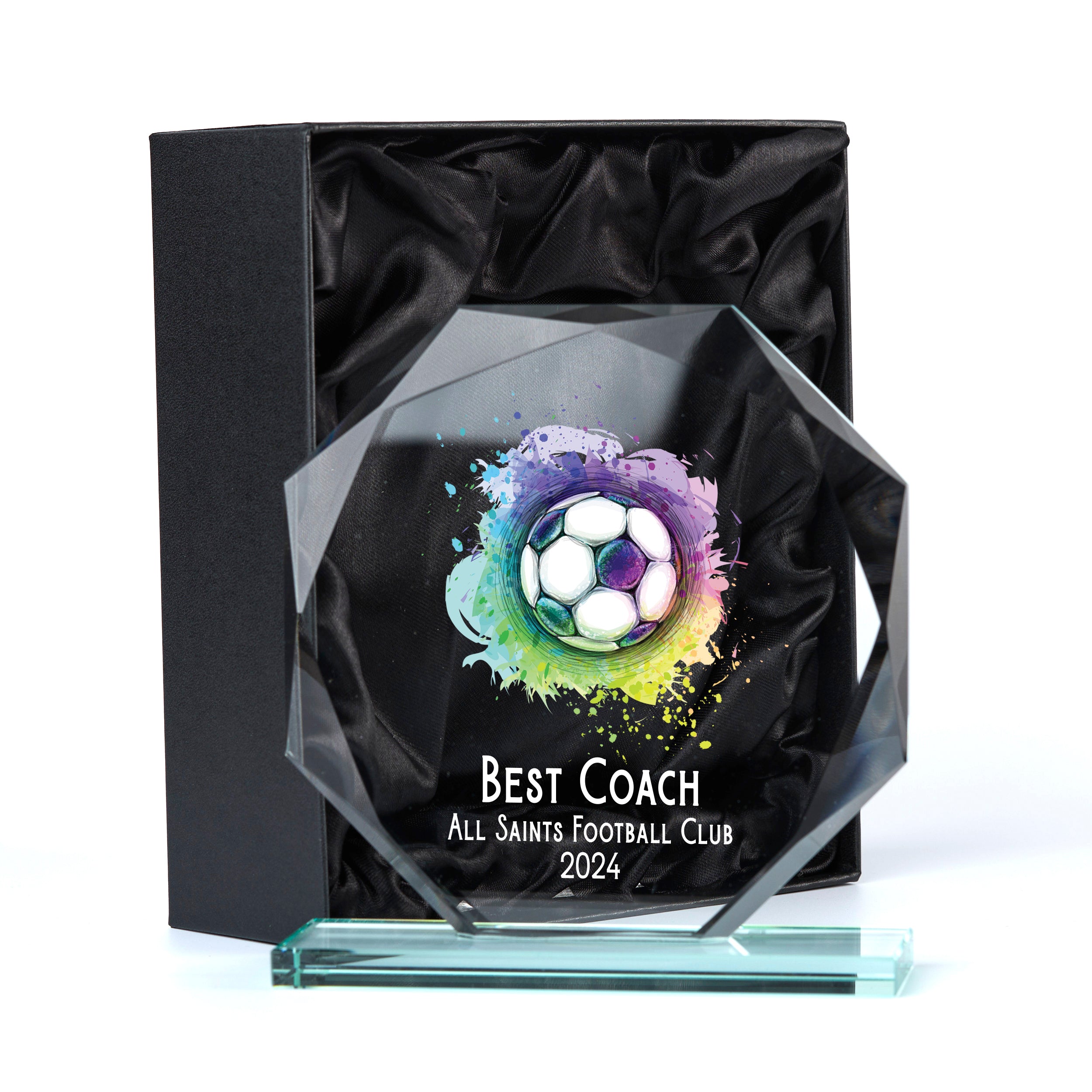 Crafted from high-quality jade glass, this 15cm football trophy is the ideal way to commemorate any special event. Arriving in a luxurious silk-lined gift box, this personalised award is an impressive and thoughtful present. Colour UV Printed ensures that the recipient's achievements will be forever immortalized on this distinguished trophy.