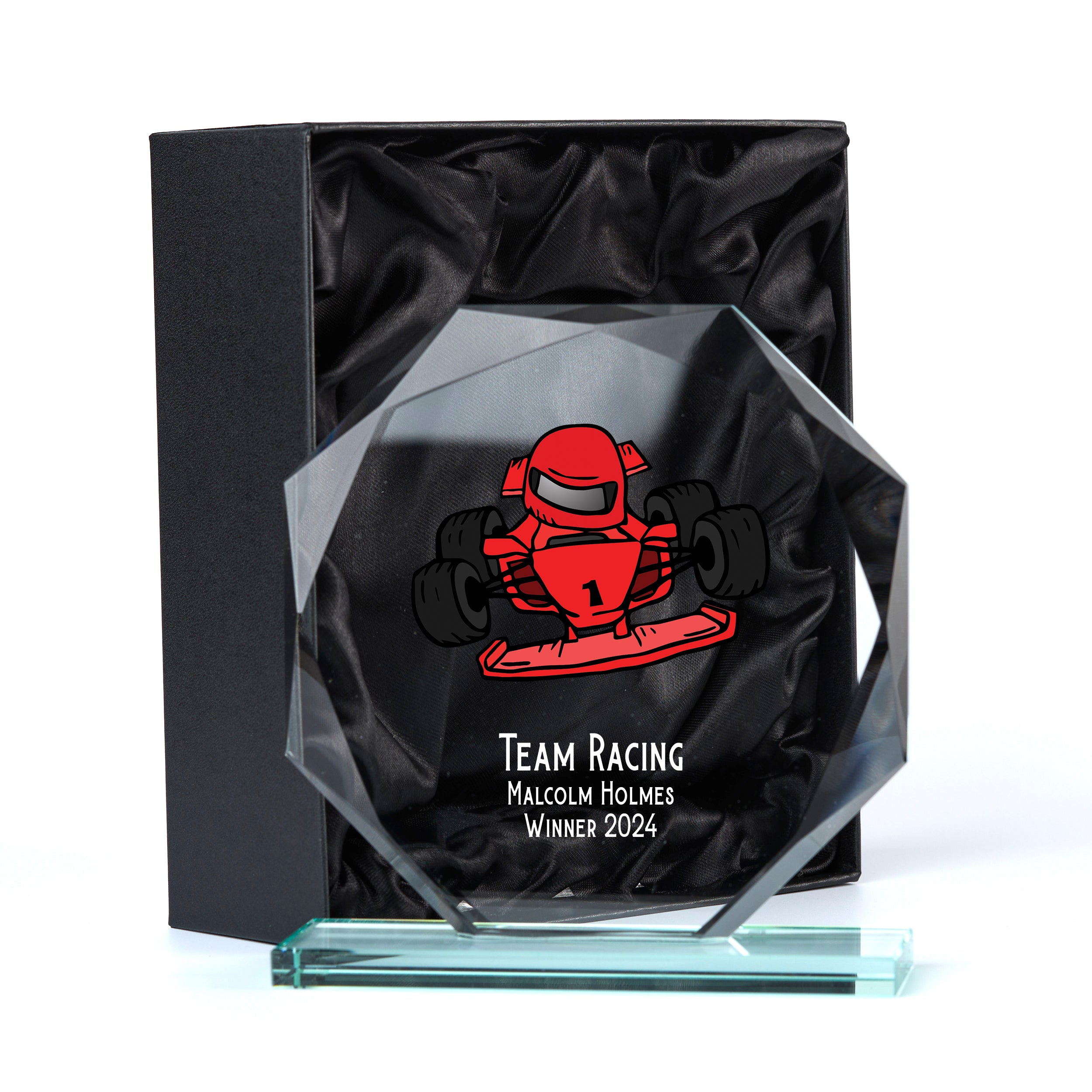 Crafted from high-quality jade glass, this 15cm Go Karting trophy is the ideal way to commemorate any special event. Arriving in a luxurious silk-lined gift box, this personalised award is an impressive and thoughtful present. Colour UV Printed ensures that the recipient's achievements will be forever immortalized on this distinguished trophy.
