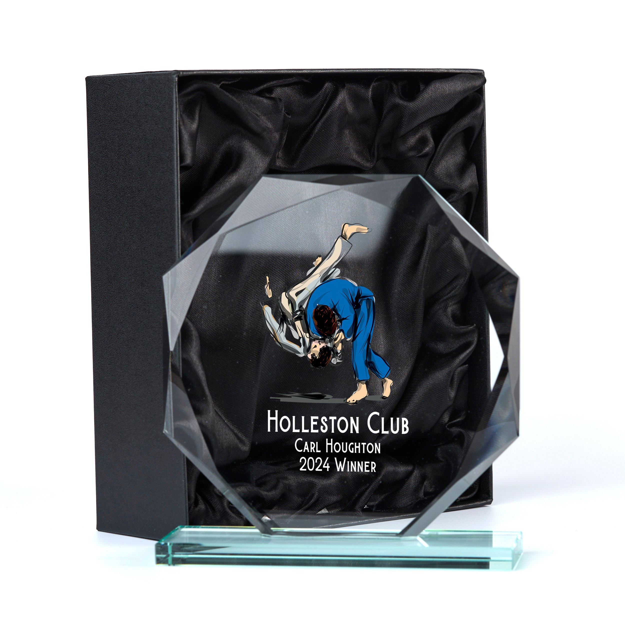Crafted from high-quality jade glass, this 15cm Martial Arts icon trophy is the ideal way to commemorate any special event. Arriving in a luxurious silk-lined gift box, this personalised award is an impressive and thoughtful present. Colour UV Printed ensures that the recipient's achievements will be forever immortalized on this distinguished trophy.