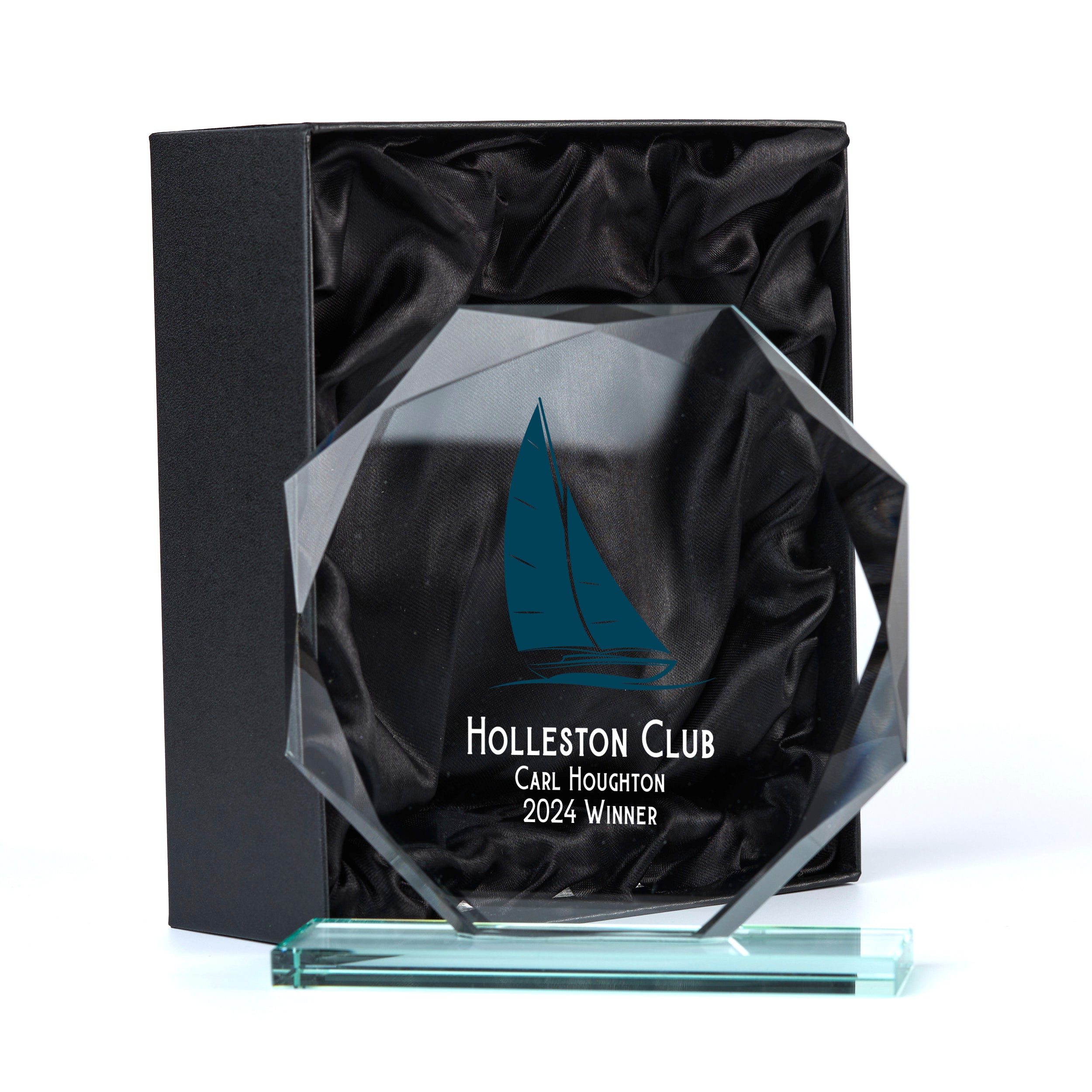 Crafted from high-quality jade glass, this 15cm Sailing icon trophy is the ideal way to commemorate any special event. Arriving in a luxurious silk-lined gift box, this personalised award is an impressive and thoughtful present. Colour UV Printed ensures that the recipient's achievements will be forever immortalized on this distinguished trophy.