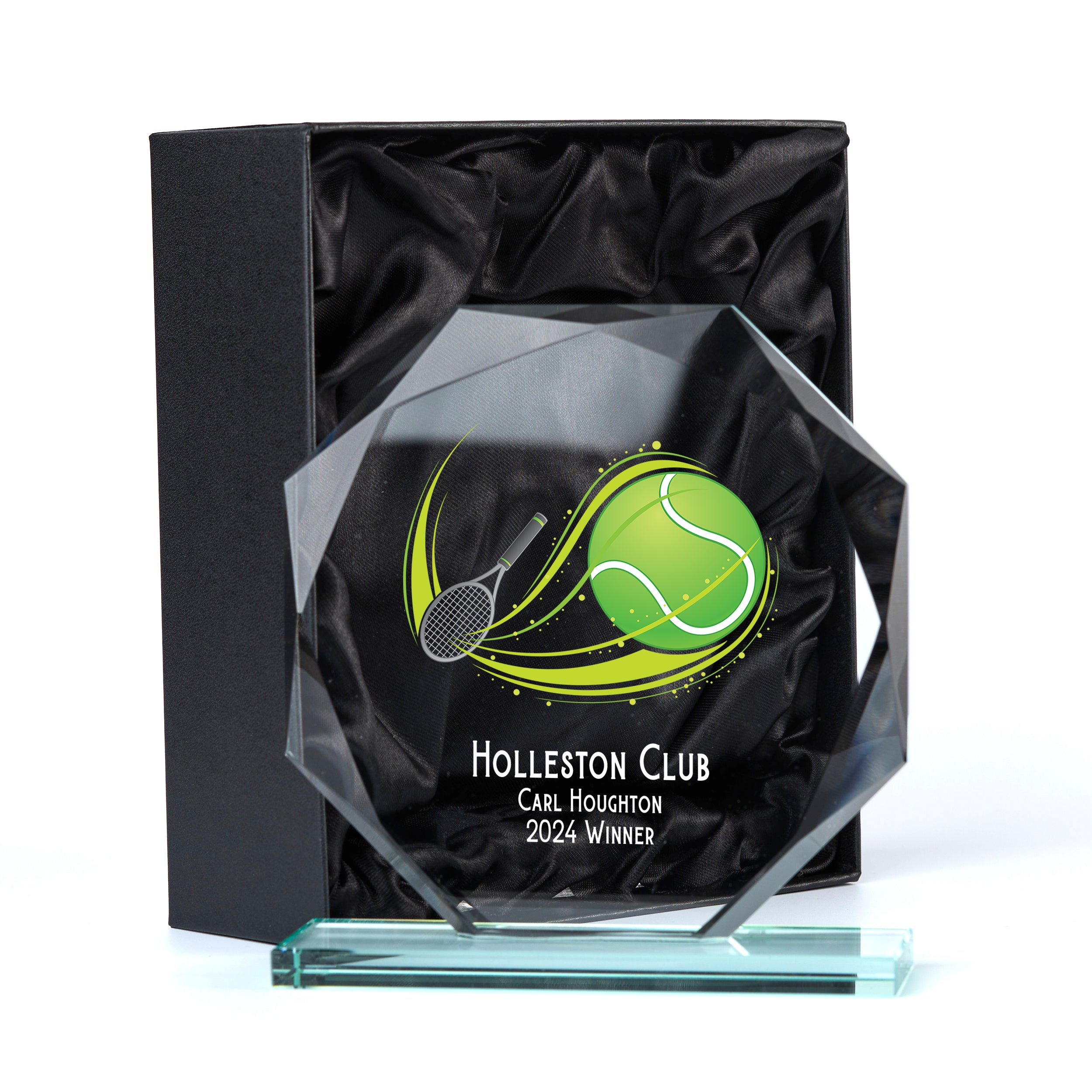 Crafted from high-quality jade glass, this 15cm tennis trophy is the ideal way to commemorate any special event. Arriving in a luxurious silk-lined gift box, this personalised award is an impressive and thoughtful present. Colour UV Printed ensures that the recipient's achievements will be forever immortalized on this distinguished trophy.