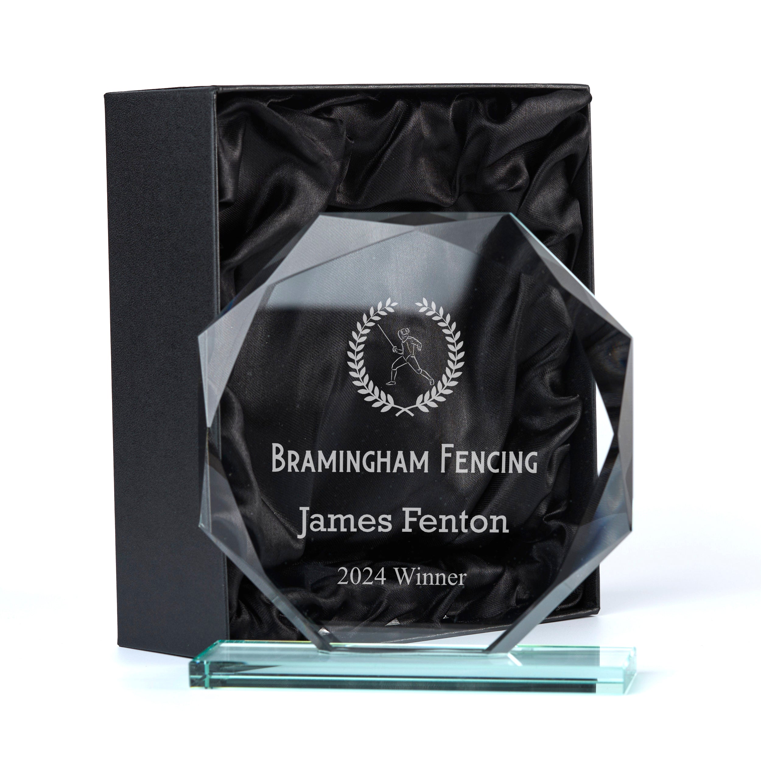 Crafted from high-quality jade glass, this 15cm Fencing trophy is the ideal way to commemorate any special event. Arriving in a luxurious silk-lined gift box, this personalised award is an impressive and thoughtful present. Laser engraving ensures that the recipient's achievements will be forever immortalized on this distinguished trophy.