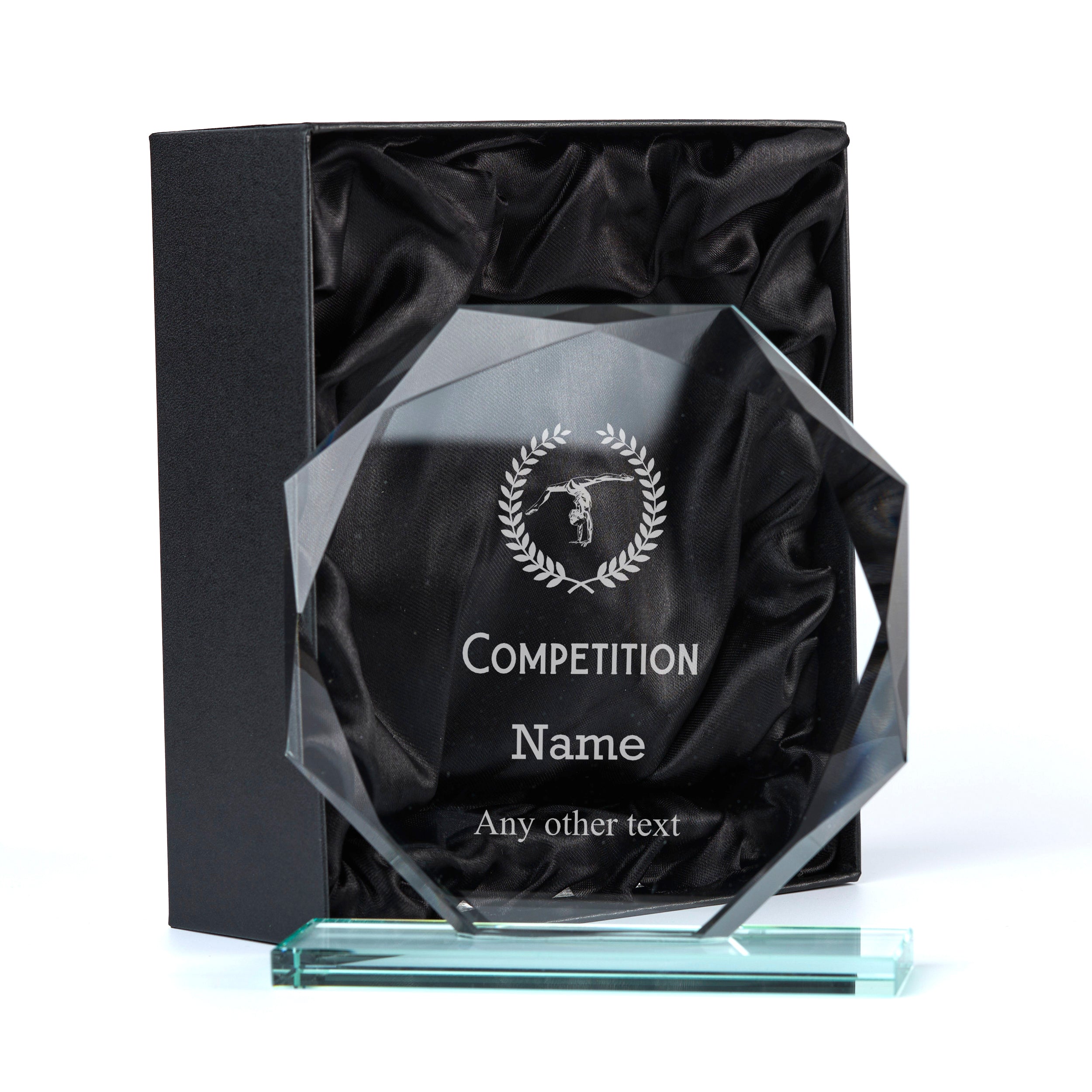 Crafted from high-quality jade glass, this 15cm Gymnastics trophy is the ideal way to commemorate any special event. Arriving in a luxurious silk-lined gift box, this personalised award is an impressive and thoughtful present. Laser engraving ensures that the recipient's achievements will be forever immortalized on this distinguished trophy.
