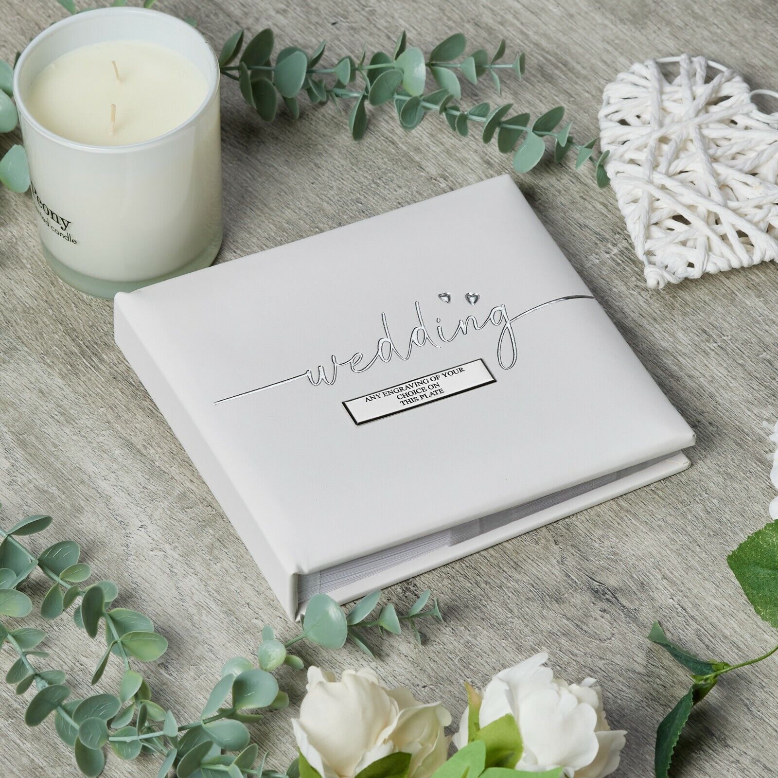 The Wedding photo album has been designed and manufactured to the highest quality. The outside of the album is white leatherette. The wording "Wedding" is embossed in silver while there are two hearts on the cover.