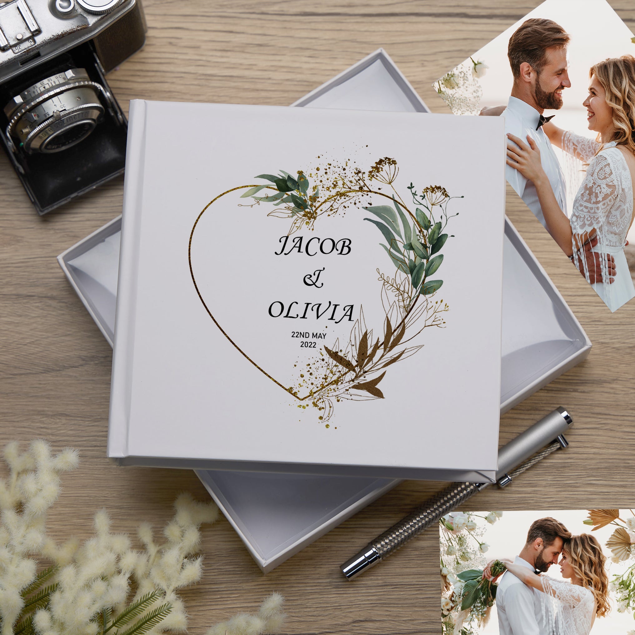 This customised wedding album makes a perfect gift and features a Gold Green Wreath heart. Lovely Photo Album with...
