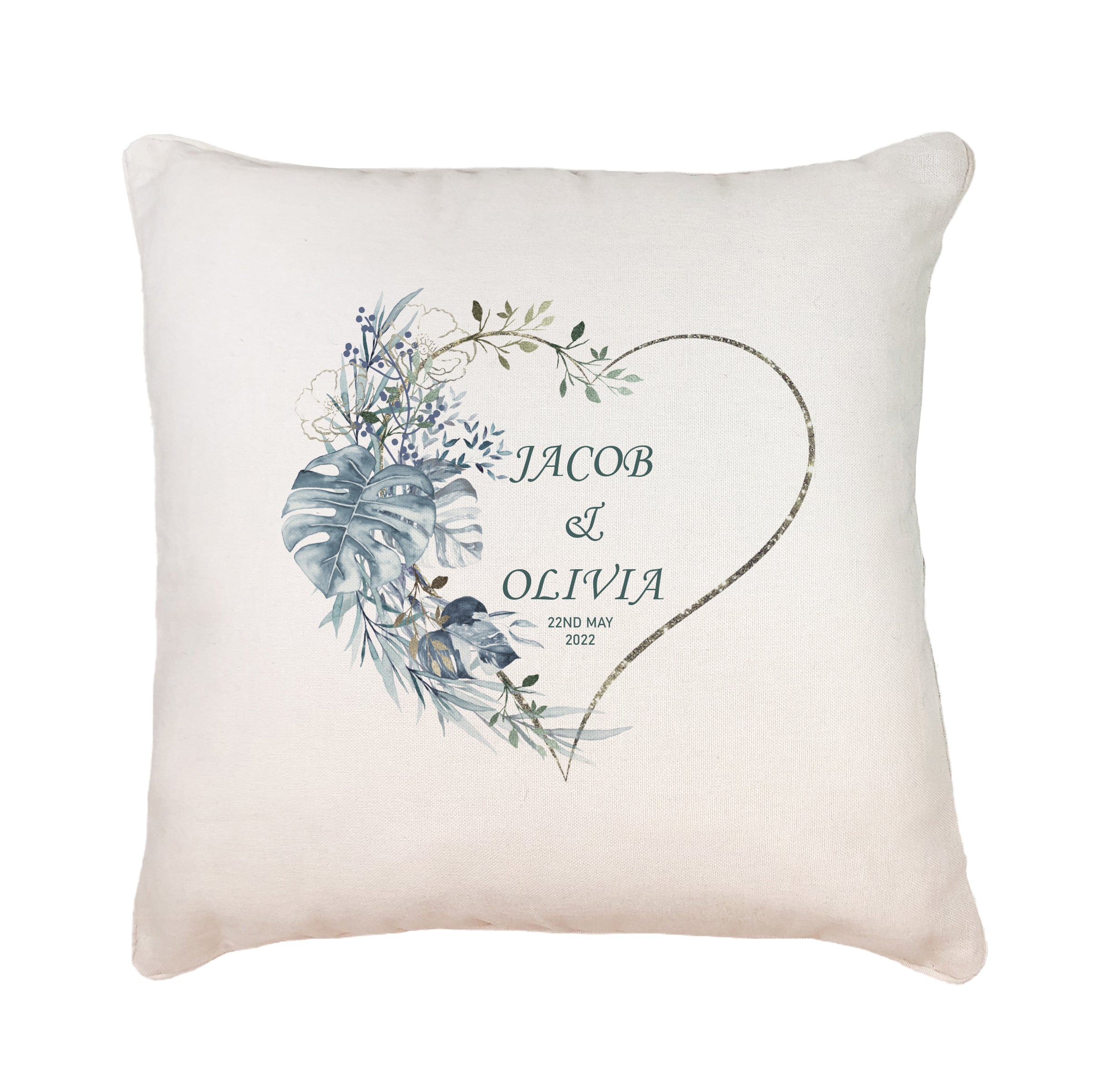 Personalised Wedding Day Cushion Pillow Gift With Blue Tropical Palm Heart