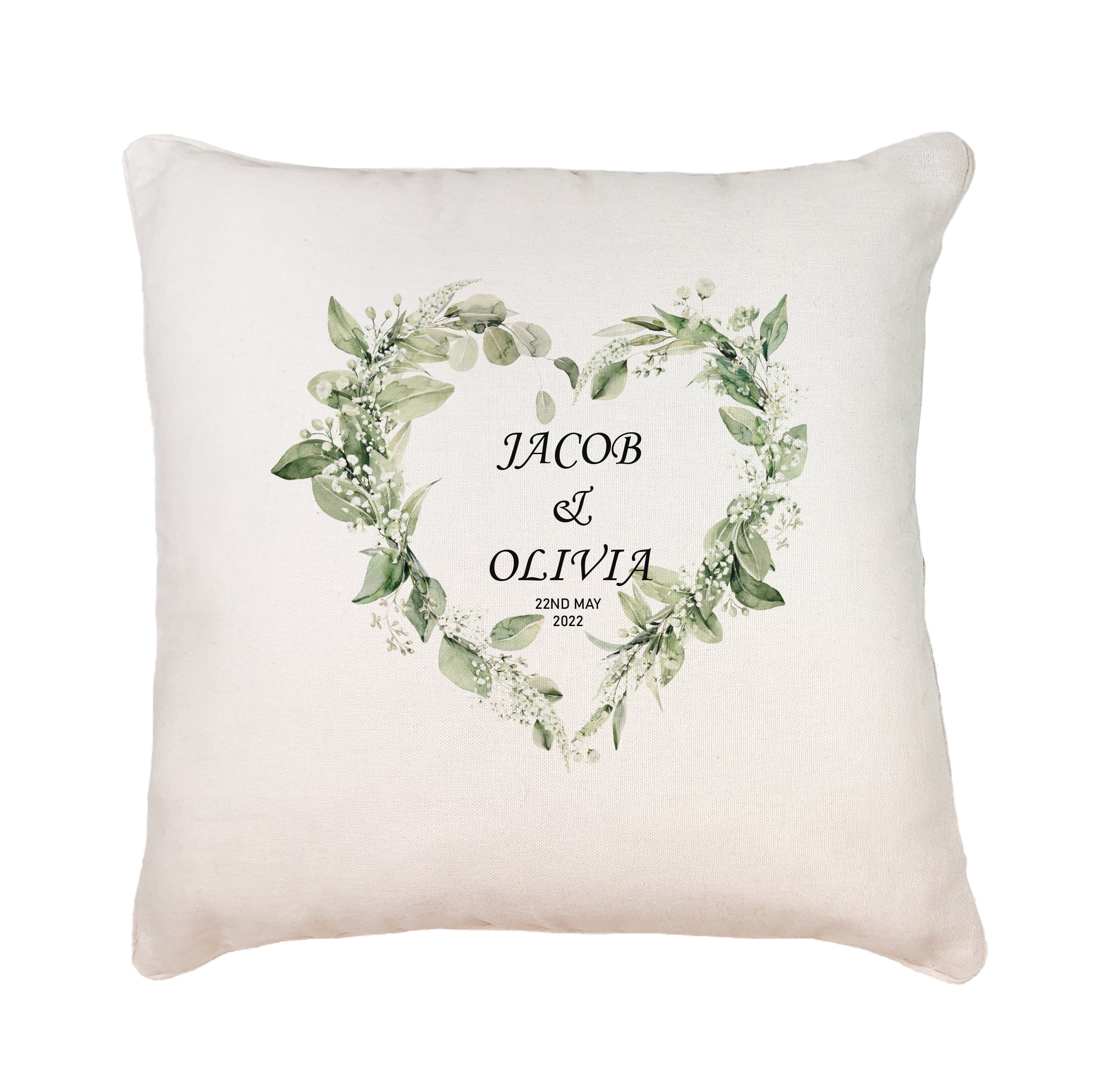 Personalised Wedding Day Cushion Pillow Gift With Green Floral Heart