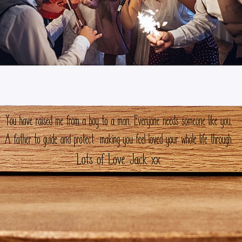 The frame has a oak wood finish with the engraving Father of the Bride on top along with a fixed sentiment and personalised wording to the bottom. The photo frame will hold two standard 6" x 4" photos The personalisation is done via a laser engraver giving a deep engraved finish..