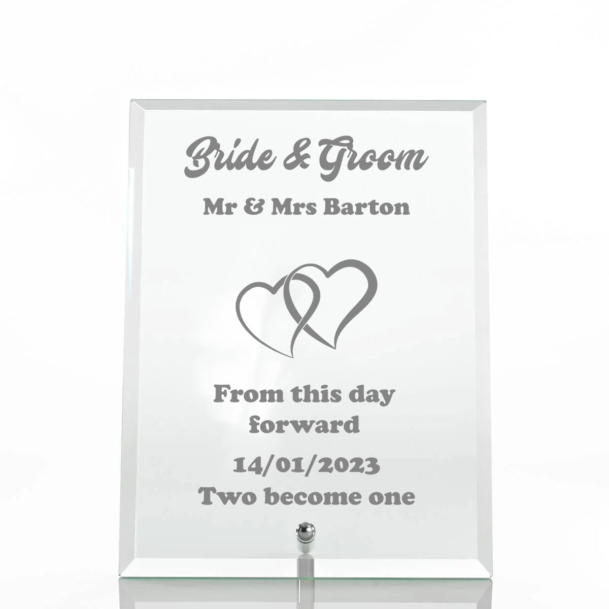 This personalised engraved heart-shaped glass plaque offers a timeless and sophisticated gift option for newlyweds. Expertly crafted with precision engraving, it allows you to customise the names of the bride and groom along with their wedding date, creating a truly unique and meaningful keepsake. The clear glass design enhances its elegance, making it a beautiful display piece in any home. Perfect to commemorate the special day, this plaque is a lasting reminder of love and commitment, ideal for celebrating a memorable wedding with a personal touch.