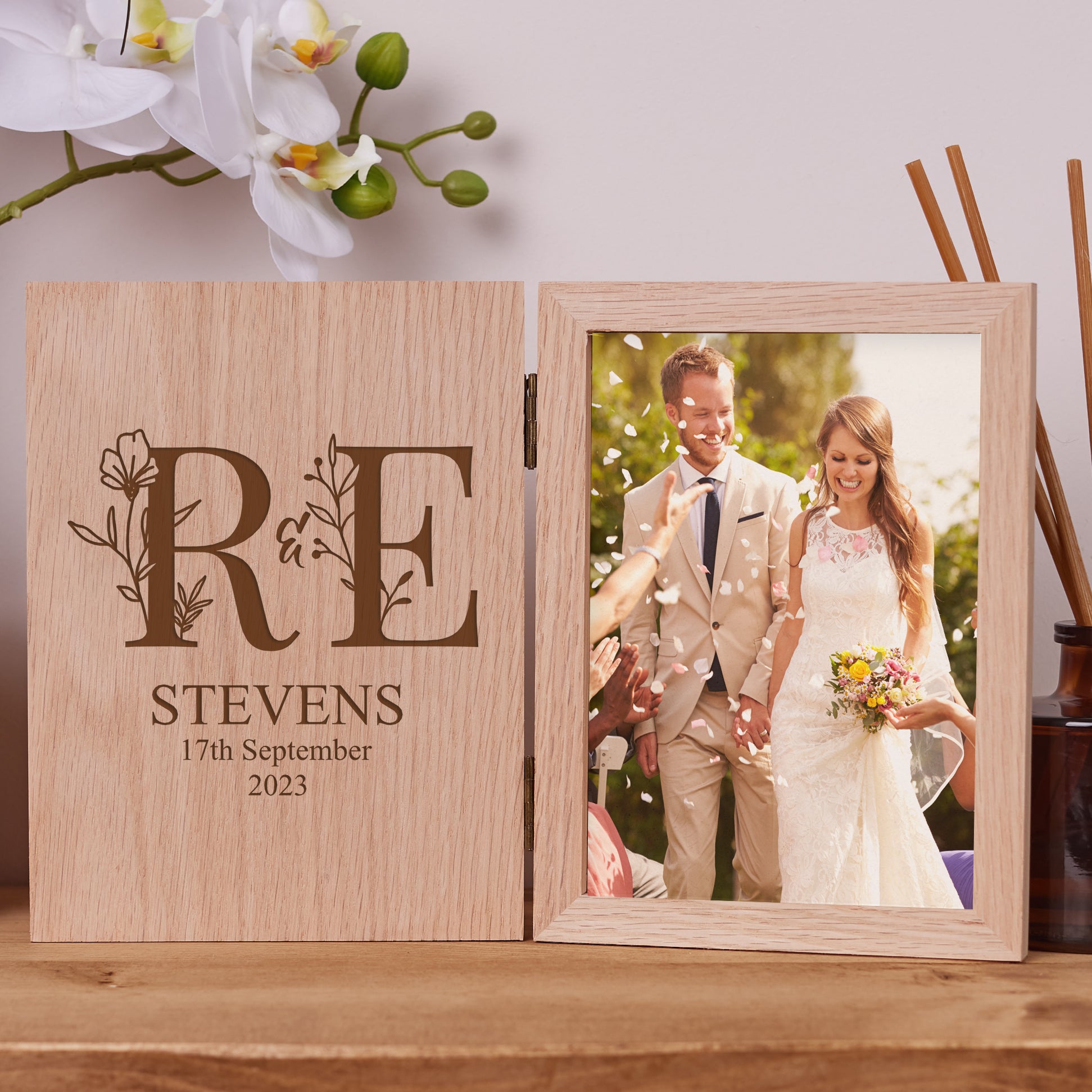 Cherish your precious memories with this beautiful solid oak wood frame. Its stunning finish and personalized engraving make it the perfect way to display your most treasured photos. With its double book design, you can showcase your photo on one side while admiring the beautiful engraving on the other. Measuring 31cm x 20cm x 1.5cm, this frame is perfectly sized to hold a 5" x 7" photo (13cm x 18cm).