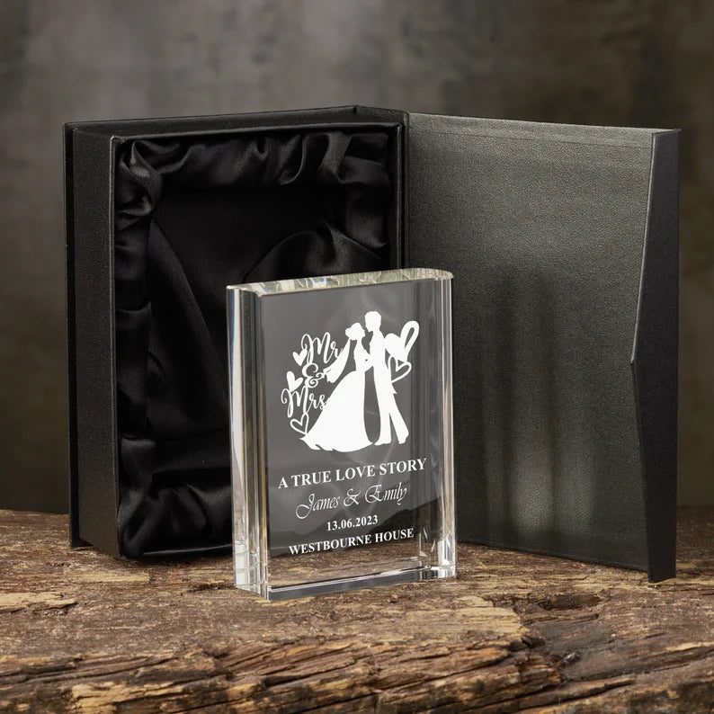 The high quality crystal is in the shape of a book and the front you have an image of a wedding couple followed by "A True Love Story"...The first names, date and wedding venue. The crystal book comes smartly presented in a silk lined gift box to make a gift that will last a lifetime. Height 120mm Width 90mm We just need The first names Date ?Venue or short sentiment