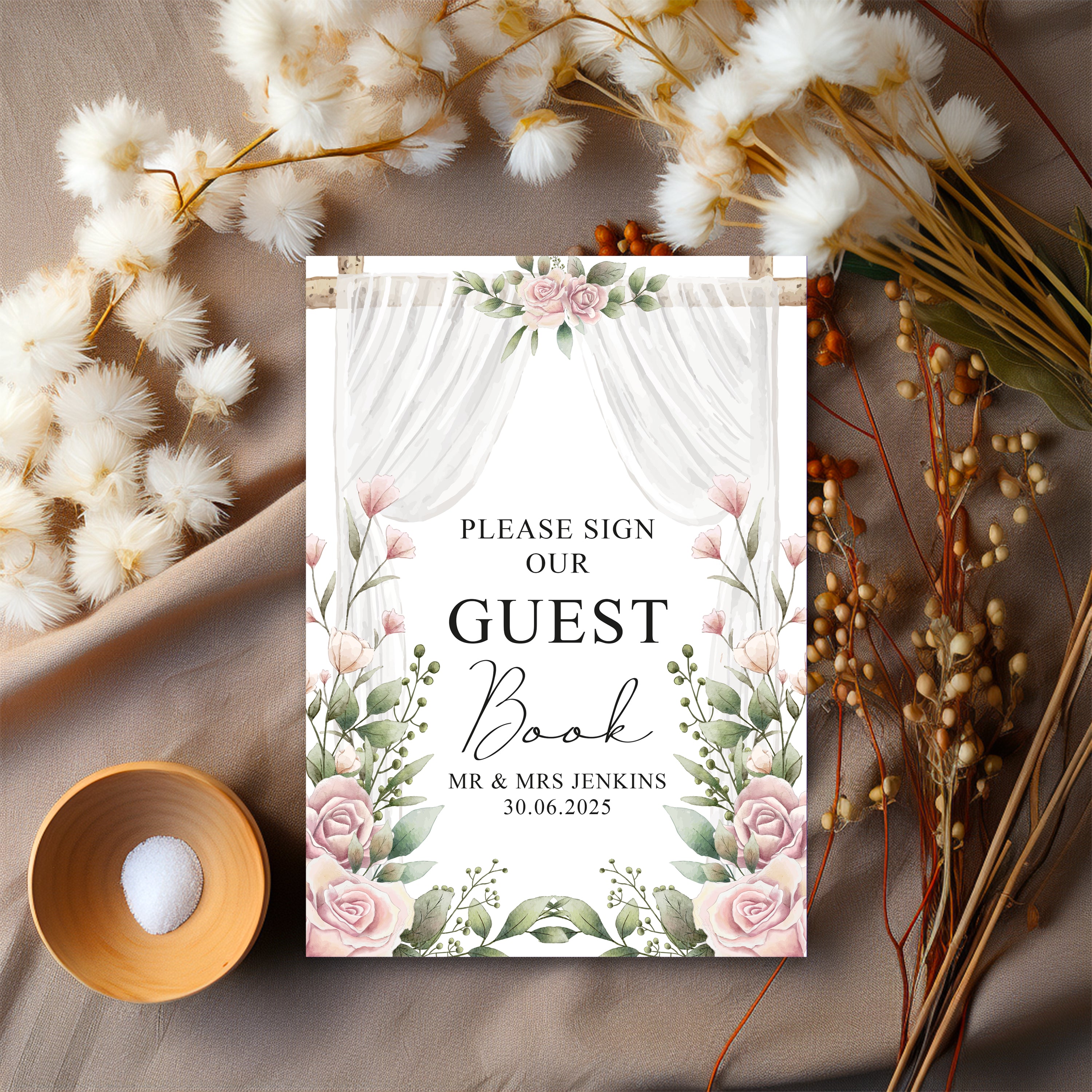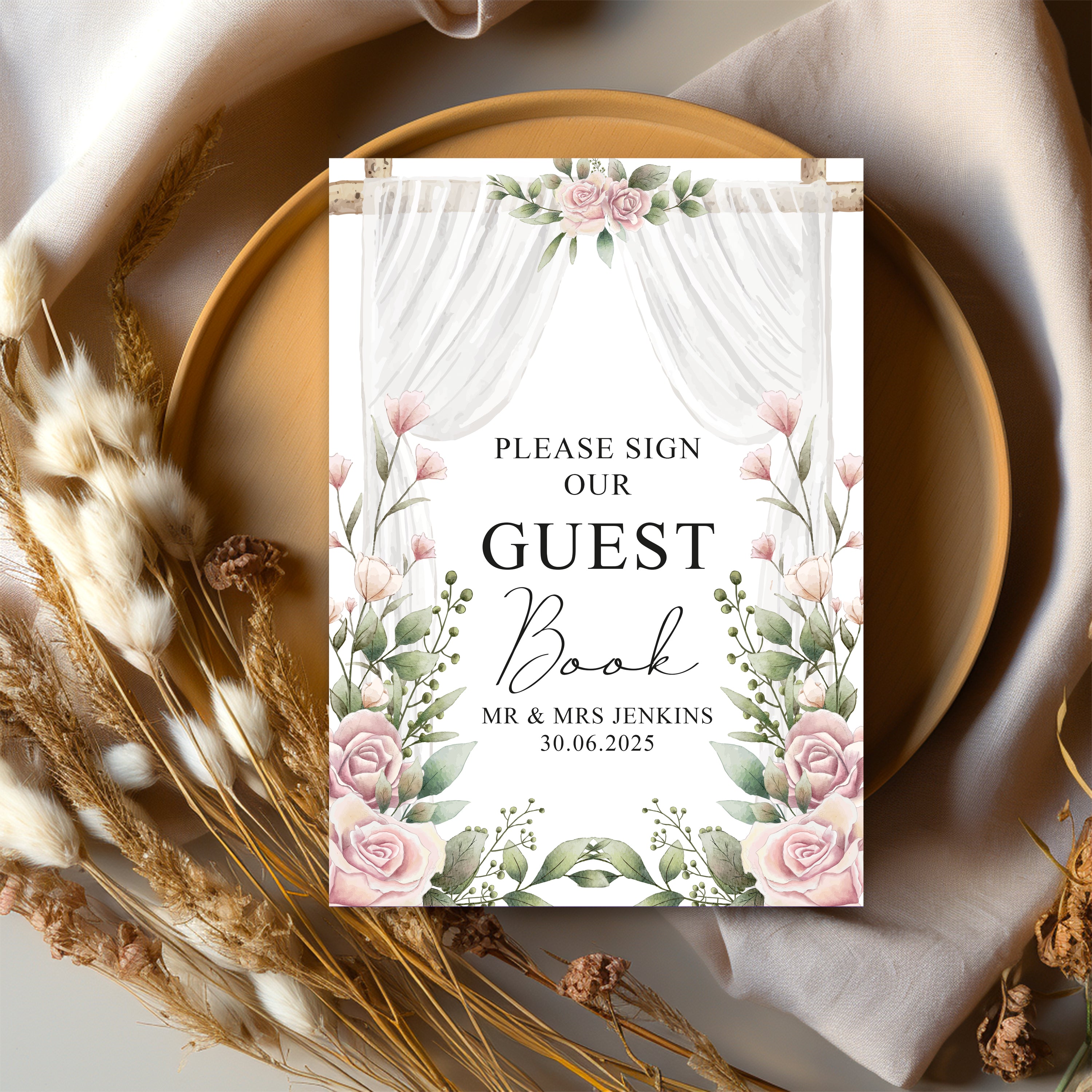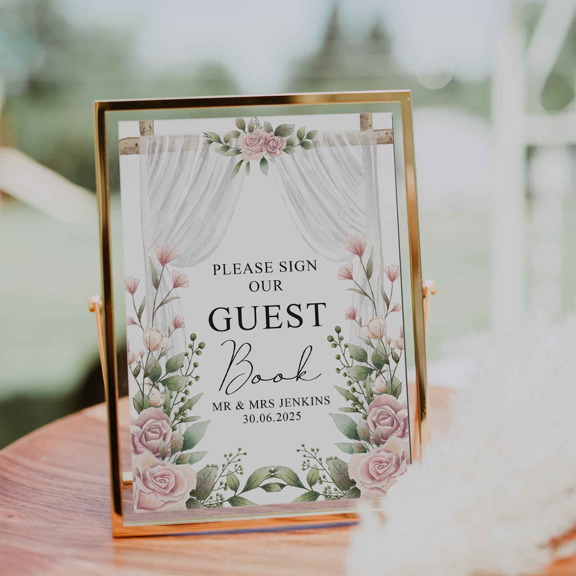 Capture the memories of your special day with this elegant, personalised sign. It's the perfect addition to any wedding table, adding a touch of sophistication and beauty while preserving your precious memories.
