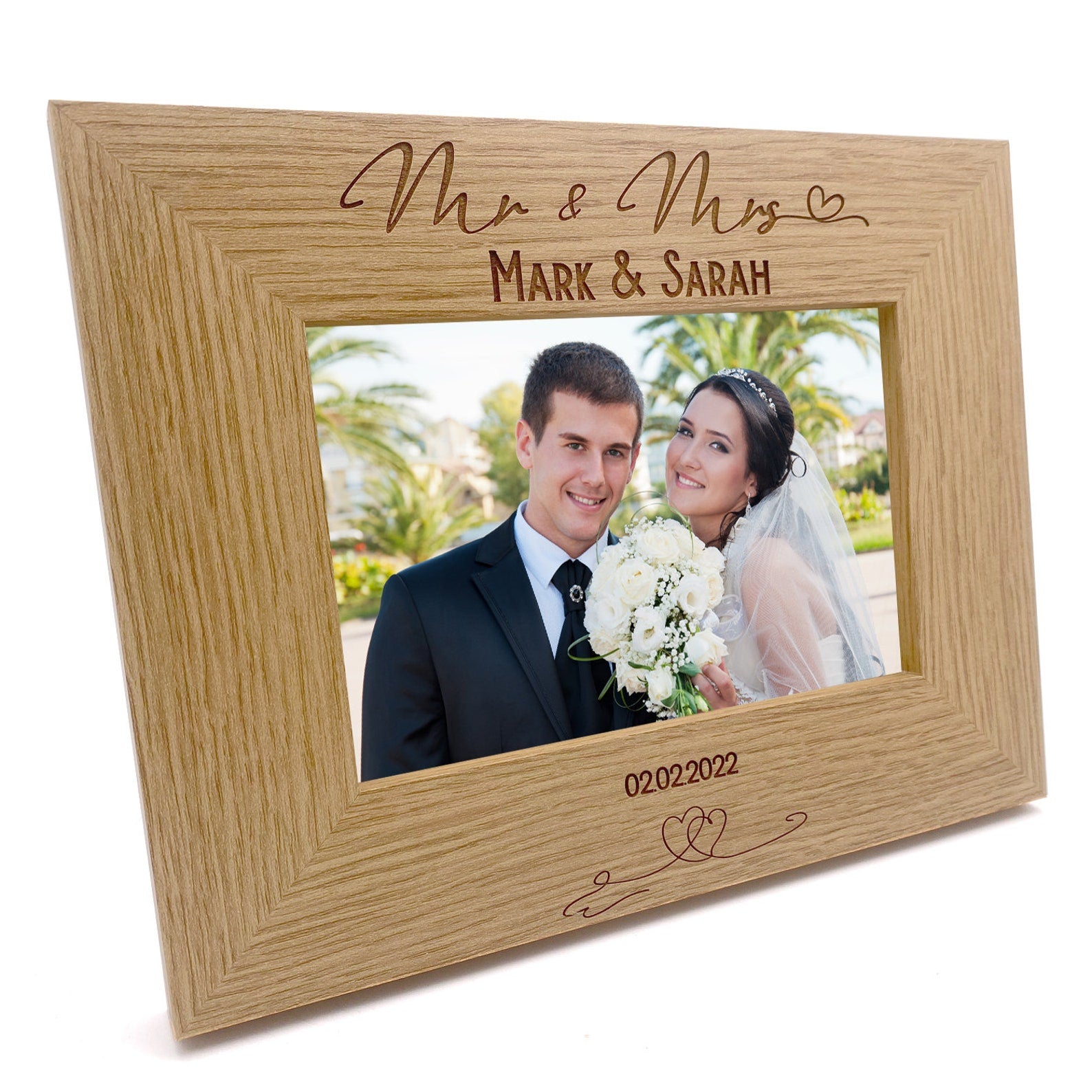 Mr and Mrs Love Heart Wedding Photo Frame Gift Landscape Engraved Wooden FW622