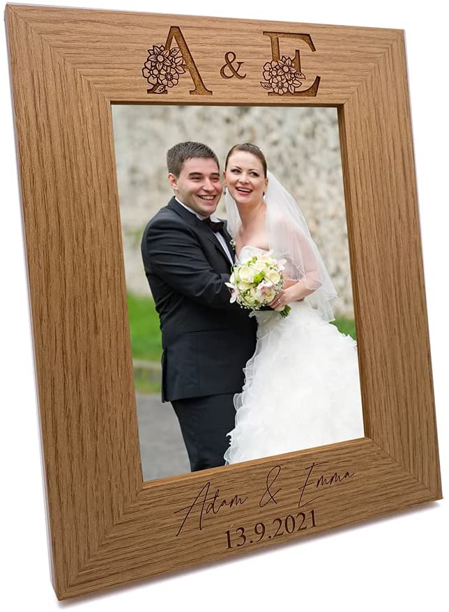 The frame has a oak wood finish with the engraving of "floral letters from the first names" on top while underneath you have the names and date Please select the photo frame size you require, the sizes are for the photo size.