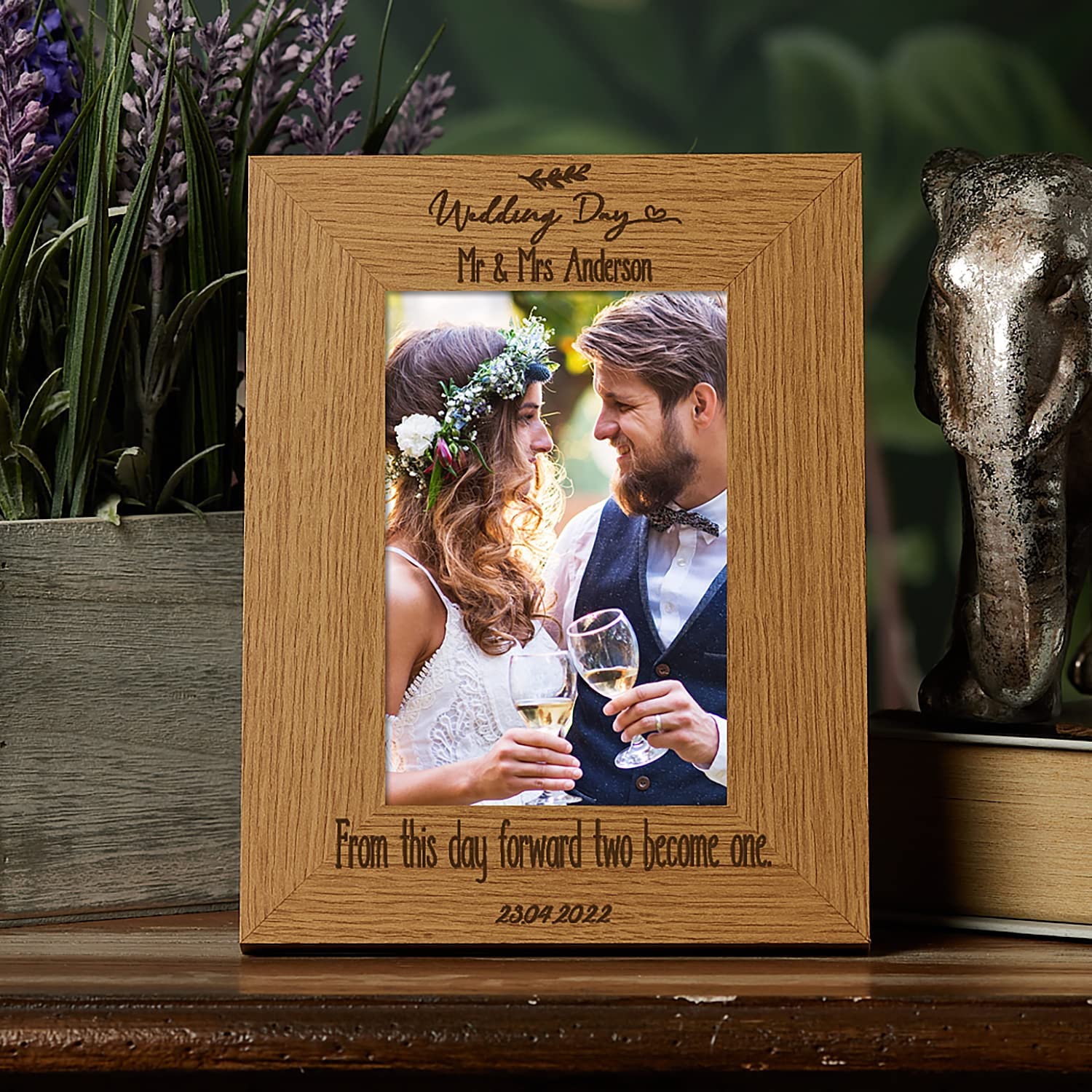 The frame has a solid wood finish with the engraving of Wedding Day and Mr and Mrs Name to the top while you have the date and the sentiment From this day onward two become one. Please select the photo frame size you require, the sizes are for the photo size. Can be both wall hung as well as stood flat. Please simply message us during checkout, though should that be missed then please mail us from your order.