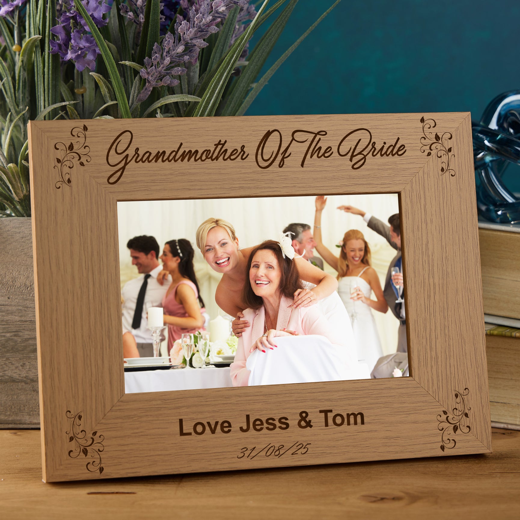 This personalised photo frame is crafted with a refined oak wood finish, featuring the elegant engraving "Grandmother Of The Bride" prominently displayed at the top. Below the engraving, there is a dedicated area for your custom message, allowing you to add a heartfelt sentiment or special wording to make the gift truly unique. You can choose from various frame sizes, each corresponding to the size of the photo you wish to display, ensuring a perfect fit for your cherished image. Designed for stability, the frame includes a sturdy stand on the back, enabling it to sit securely on any flat surface, whether a mantelpiece, side table, or display shelf. This thoughtful gift combines timeless craftsmanship with personalisation, making it an ideal keepsake to honour the grandmother’s special role on the wedding day.