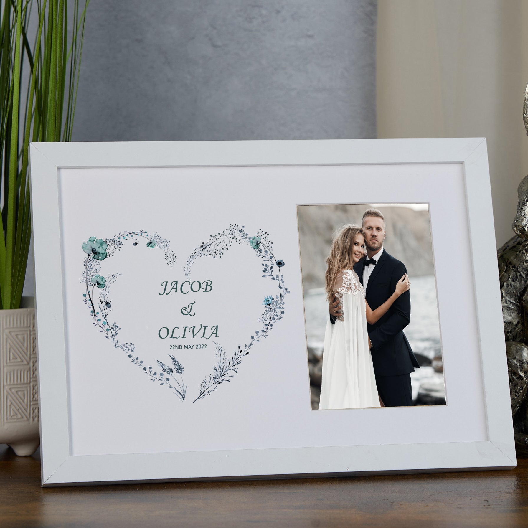 Celebrate your special day with this personalised wedding photo frame featuring a delicate blue floral heart design. Crafted to highlight your cherished wedding memories, this frame adds a touch of elegance and personalization to any space. Its timeless style makes it a thoughtful keepsake or gift for couples, preserving moments that last a lifetime. Perfect for showcasing your favourite wedding photo in a meaningful and beautiful way.