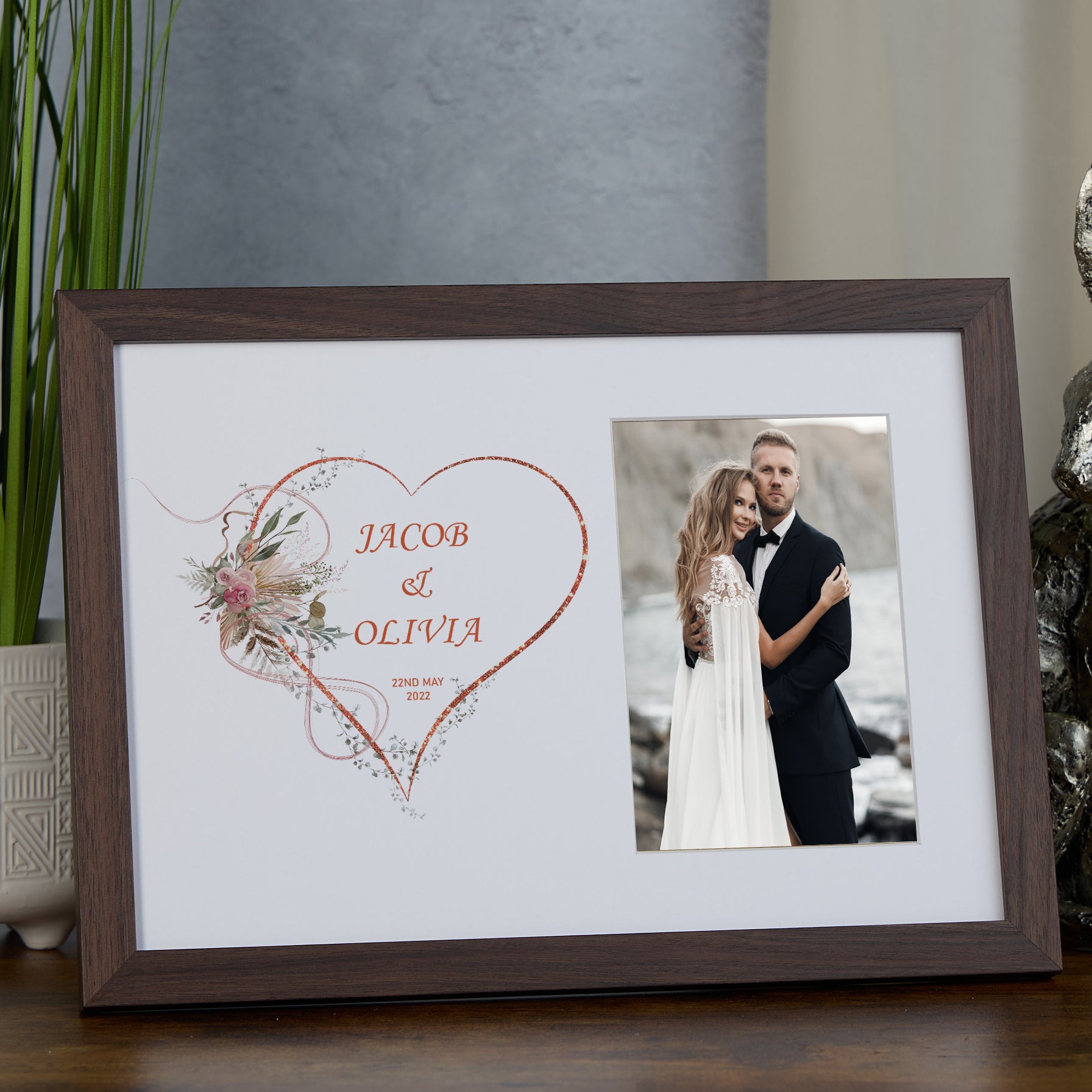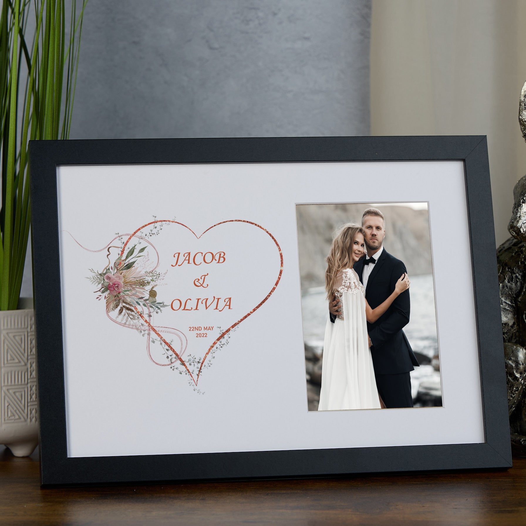 Celebrate lifelong memories with this Personalised Wedding Photo Frame featuring a rose gold floral heart design. Crafted to elegantly showcase your most treasured wedding photograph, this frame combines timeless charm with modern sophistication. The delicate rose gold floral heart adds an exquisite touch, making it a standout piece in your home or a thoughtful, bespoke gift for newlyweds. Personalise it with names, dates, or a heartfelt message to create a unique keepsake that preserves the magic of your special day for years to come. Durable and stylish, this frame is perfect for commemorating love with expert craftsmanship.