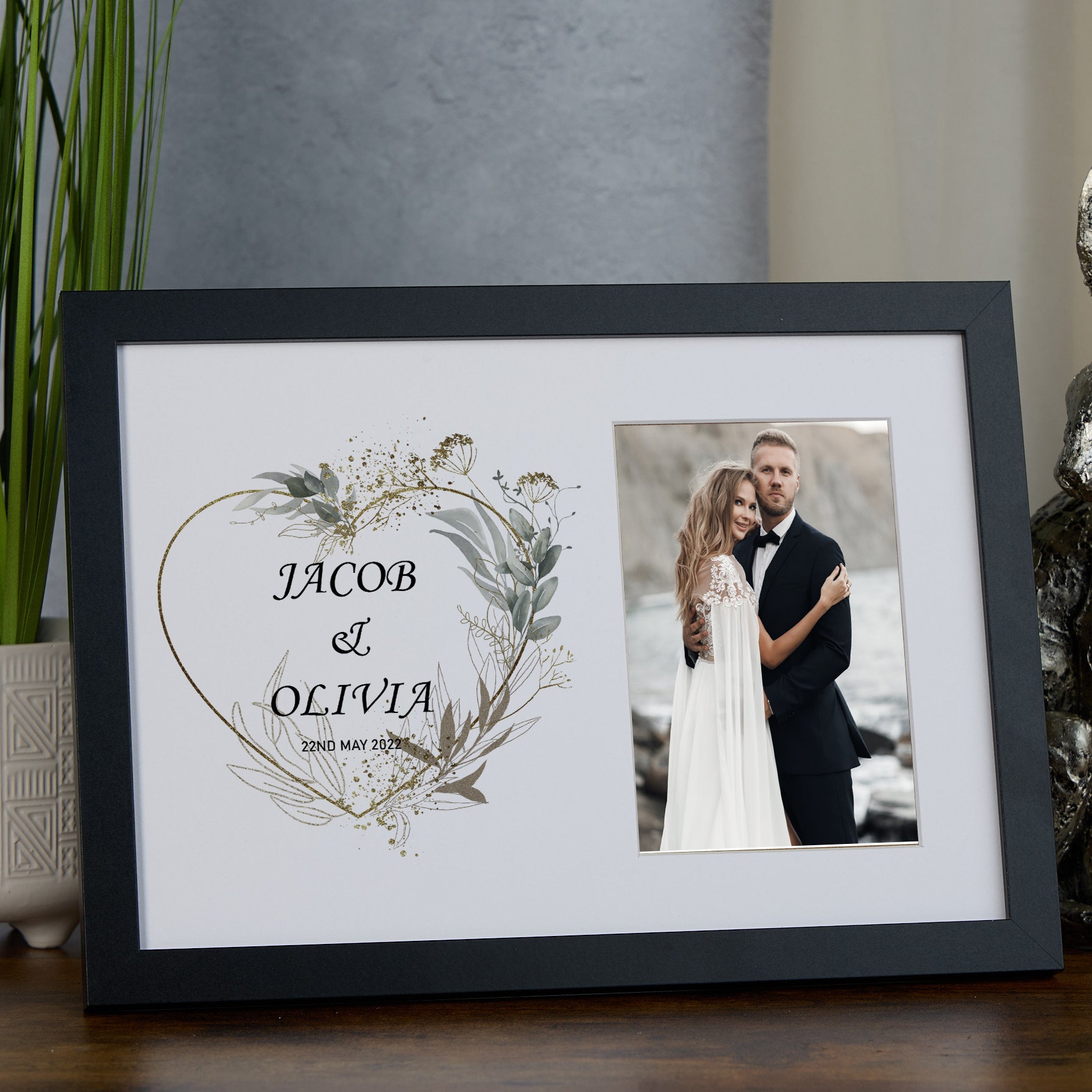 A lovely wooden frame to display that all important or memorable photo. The frame has an white wood finish with the personalised writing on the left and room for a 6" x 4" photo to the right There is a stand at the rear so will sit flat on any surface. Capture and treasure your special memories with our beautifully designed personalised wedding photo frame. Featuring a sleek white wood finish and customized script, this frame is the perfect way to showcase a 6" x 4" photo on any surface.