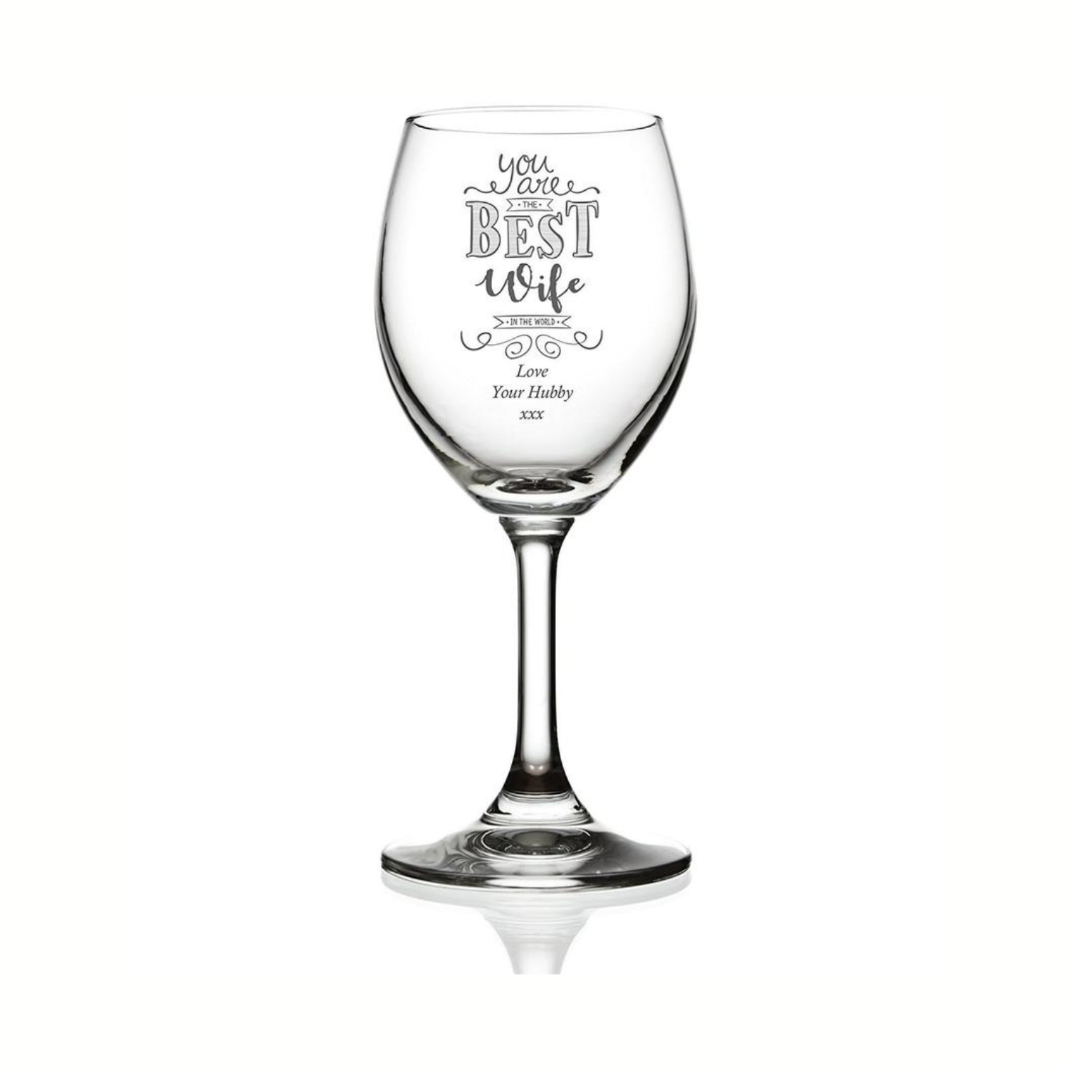 Elegantly engraved wine glass makes a perfect personalised gift for your wife. Choose up to three lines...