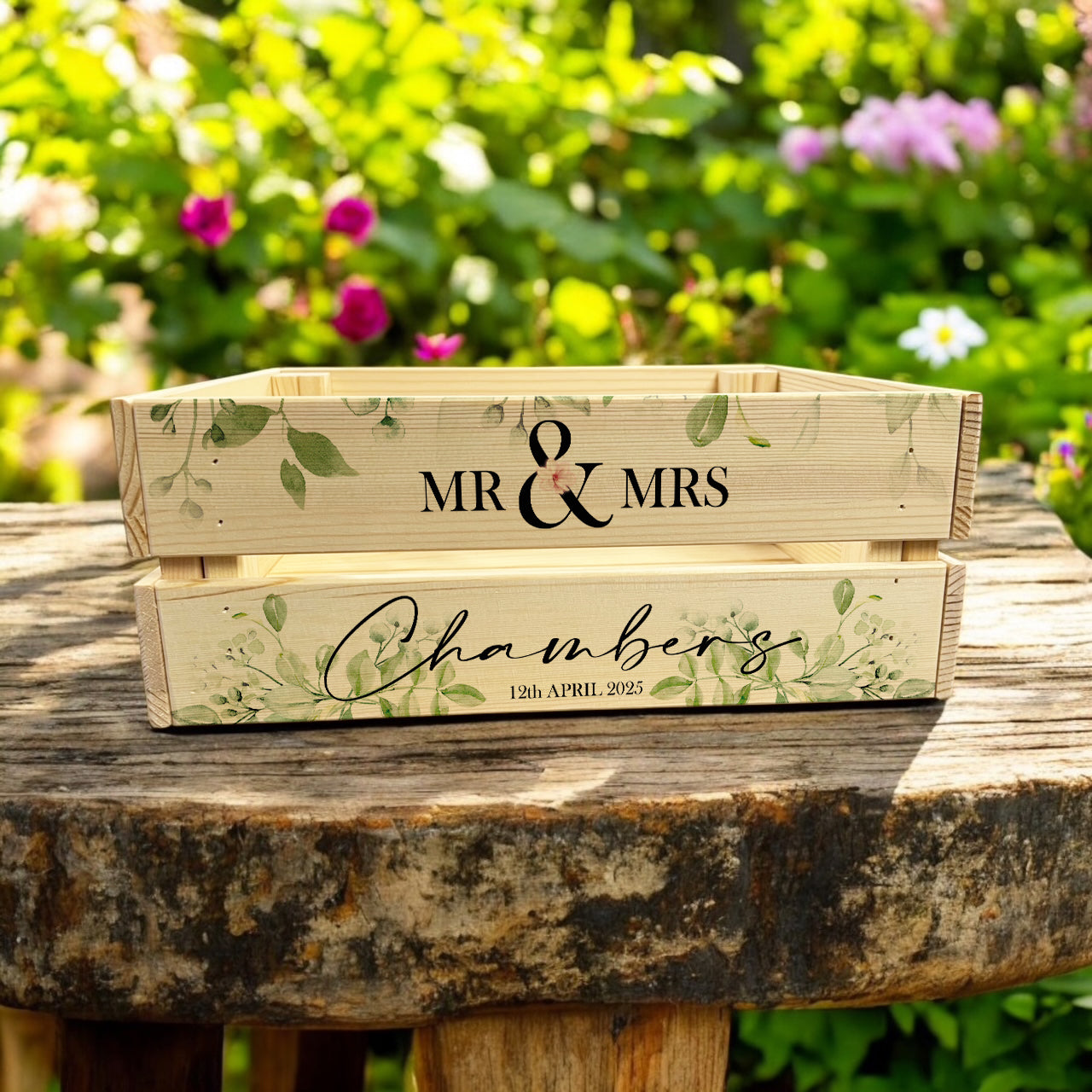 Personalised Green Leaf Wedding Crate, Wooden Crate, Wedding Hamper Decor