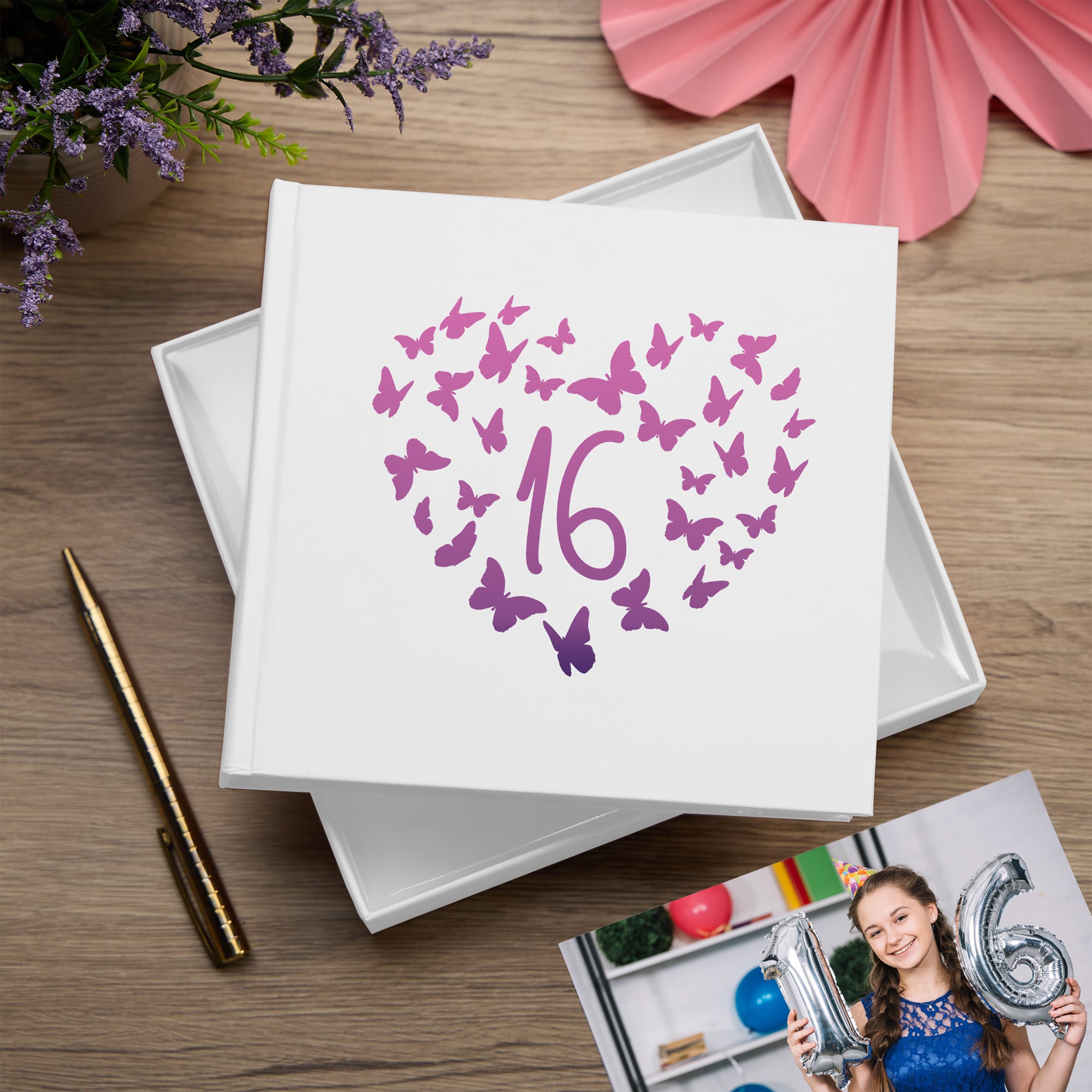 Capture every moment with ease using the 16th Birthday White Photo Album. This album can store up to 50 photos, each measuring 4"x6", making it perfect for preserving special memories. With a size of approximately 18.5cm x 19.5cm, this album is compact and convenient, and the photos are easily inserted into the album for quick organization. Additionally, there is ample space next to each photo for you to write down important details, allowing you to relive every moment in detail. Whether as a cherished keepsake or a thoughtful gift. This album comes neatly boxed, making it the perfect choice.