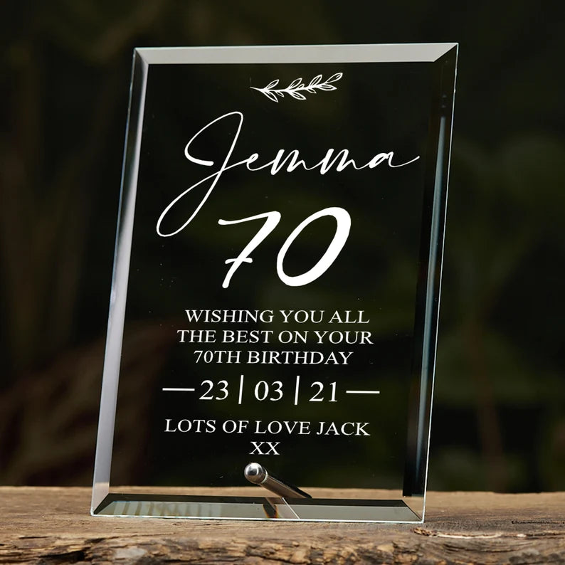 Comes with name, date and short sentiment as you please. The age and wishing you all the best on your birthday comes already engraved. So we just need a first name, date and short sentiment at the bottom e.g Jemma 16.03.2022 ?Lots of love mum Two sizes to choose from Small 6"x4" or Large 5" x 7" PLEASE NOTE THE PICTURE IS AN EXAMPLE TO SHOW THE STYLE OF TEXT - ENGRAVING CUTS OUT FROM THE GLASS AND HOLDS NO COLOUR For fixing please extend the screw piece that is inside the bar. This can be done by rotating the screw bit either anti clockwise or clockwise and this will either extend the piece out or bring it further inside the bar. The screw can come all the way out and will fit into the hole in the glass.