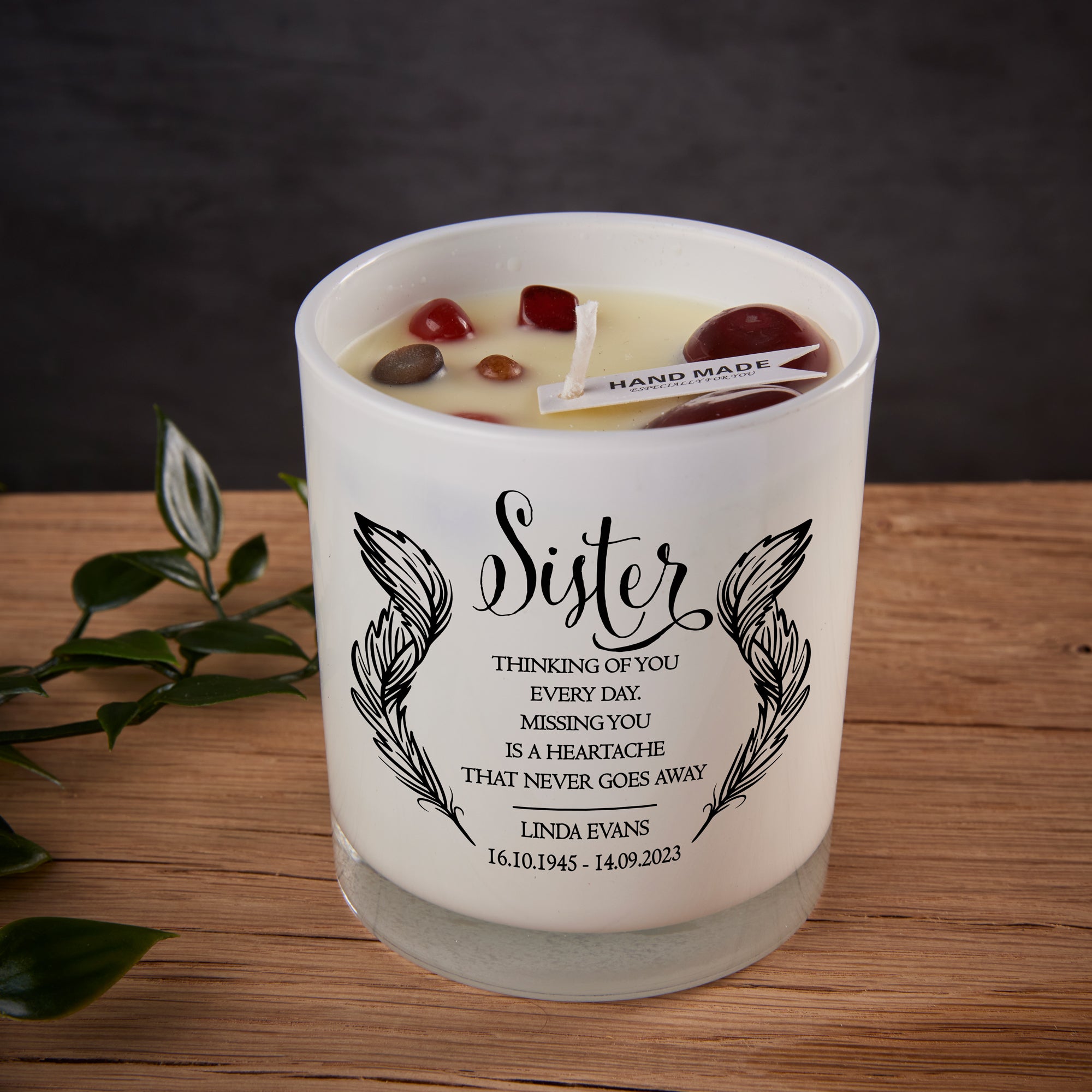 A beautiful candle with embellishments decorating the candle, making it ever so special. This lovely candle comes boxed and personalised for that special occasion. The candle measures 8cm x 8cmHandmade with a burn time of approx 80 hours weighing 640g