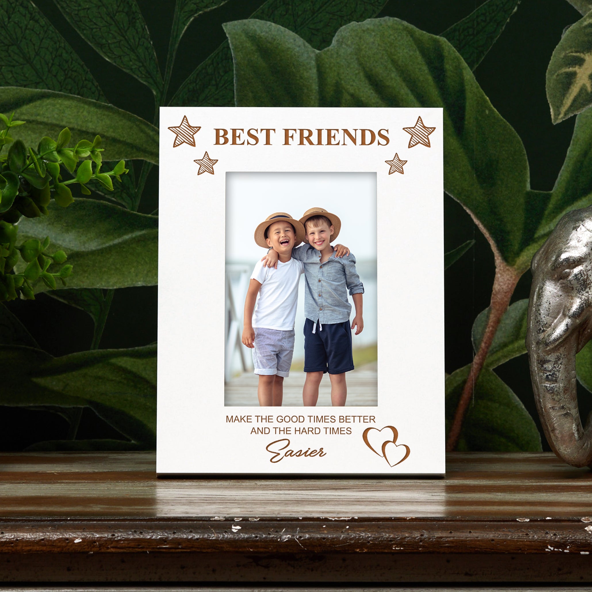 The frame has an clean white finish with the print with the details The frame will hold one standard 6" x 4" photo. There is a stand at the rear so will sit flat on any surface, but can also be wall hung.