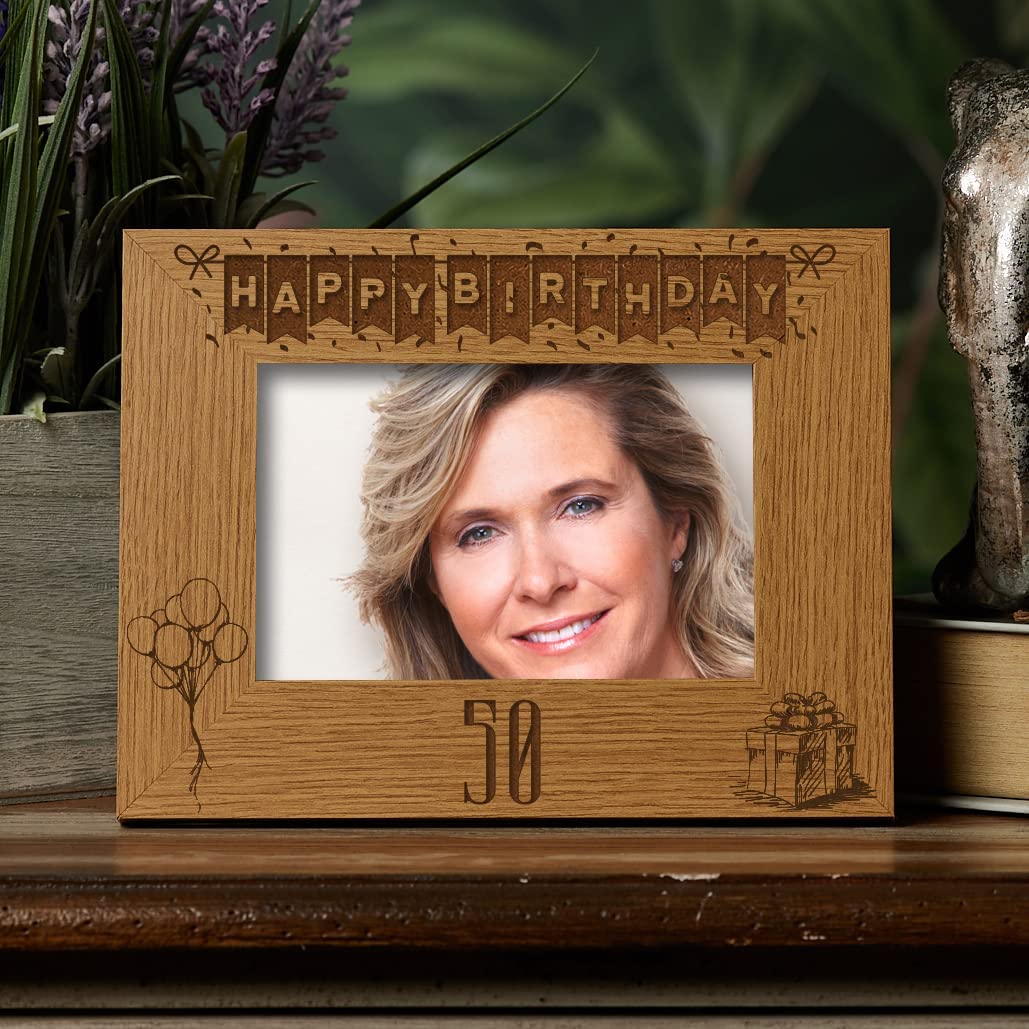Happy 50th Birthday Engraved Photo Frame Gift Stars and Balloons Landscape