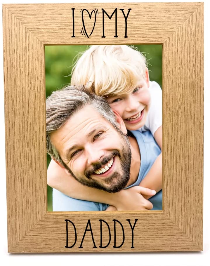 The frame has a oak wood finish with the engraving of "I love my" on top while underneath you have "daddy" Please select the photo frame size you require, the sizes are for the photo size. There is a stand at the rear so will sit flat on any surface.