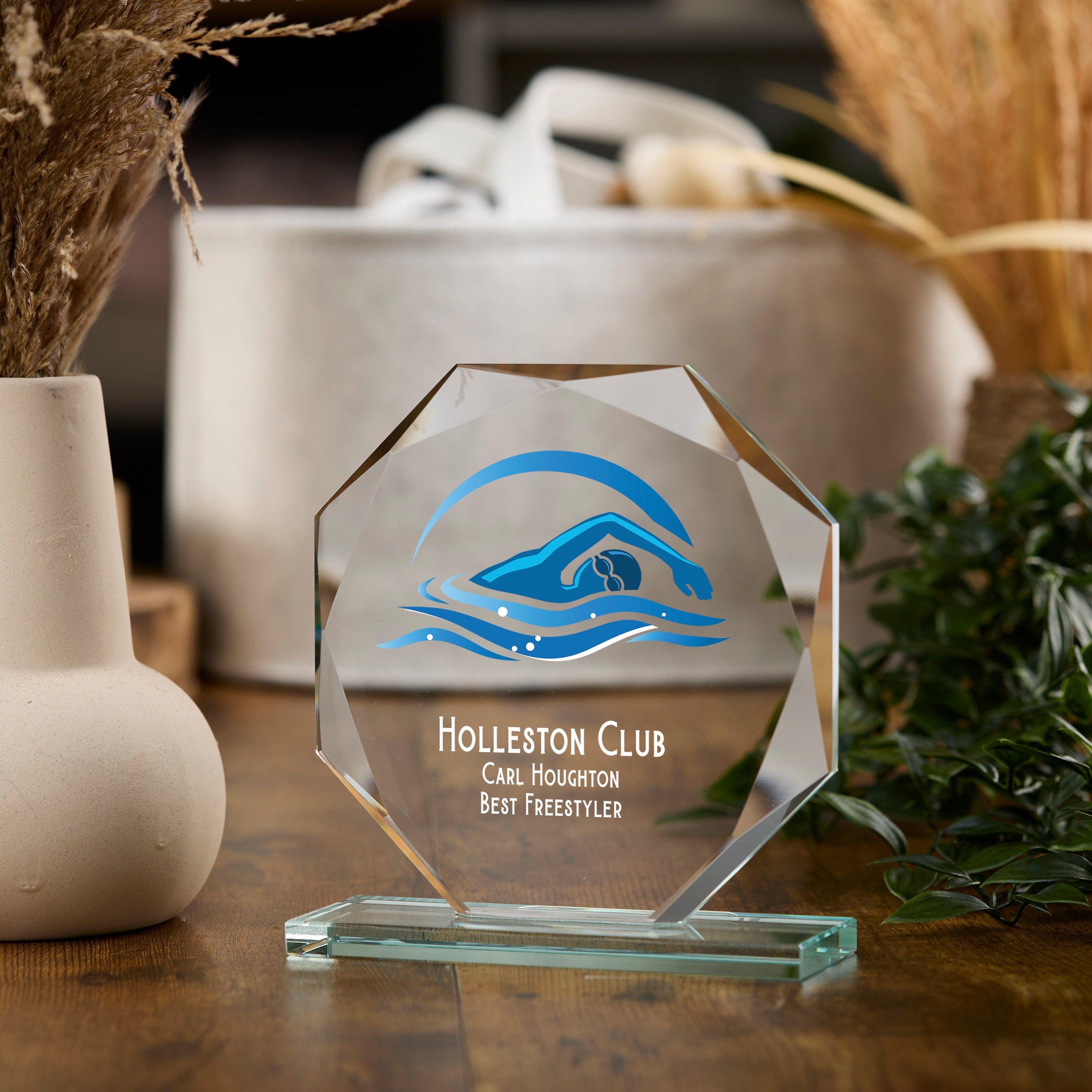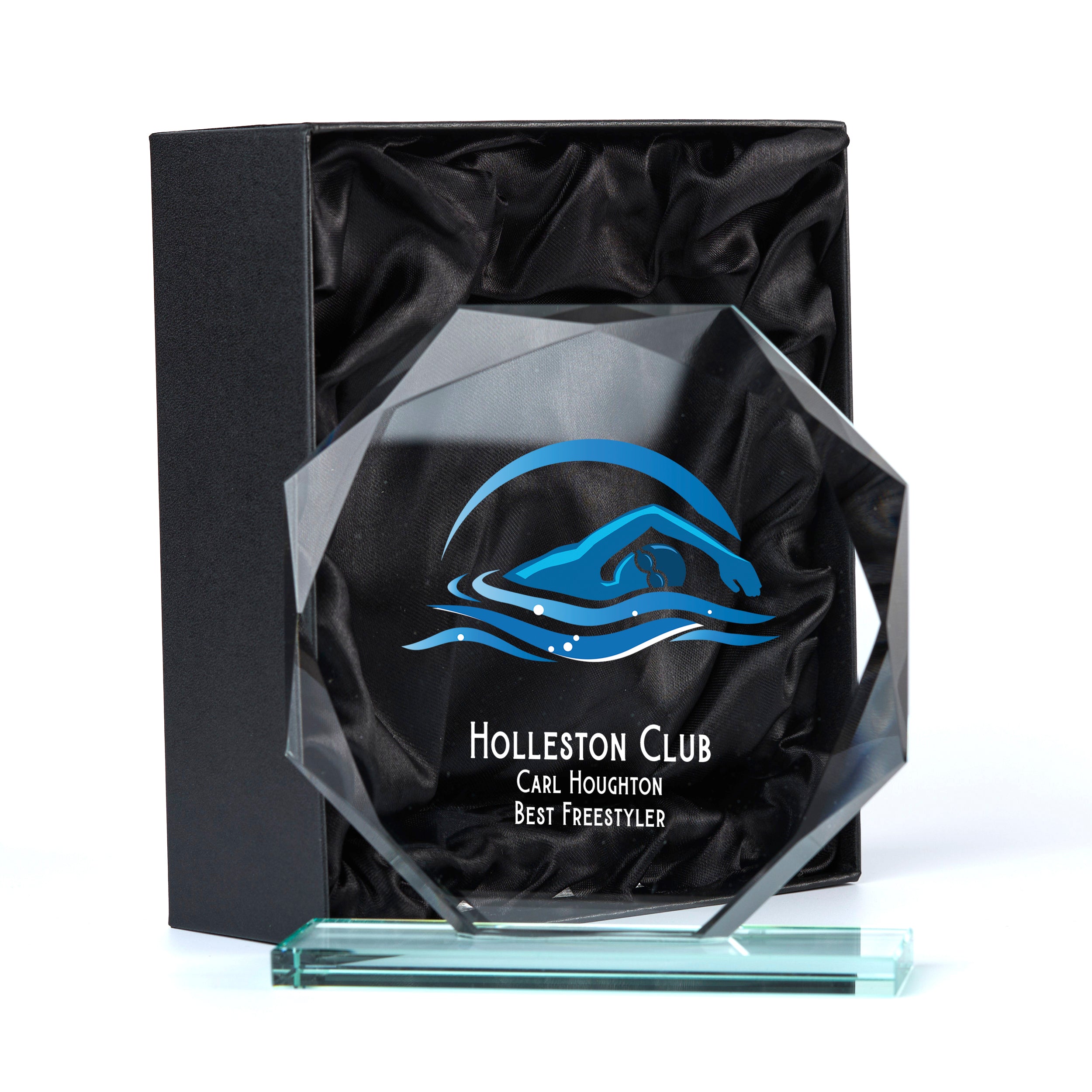 Crafted from high-quality jade glass, this 15cm swimming trophy is the ideal way to commemorate any special event. Arriving in a luxurious silk-lined gift box, this personalised award is an impressive and thoughtful present. Colour UV Printed ensures that the recipient's achievements will be forever immortalized on this distinguished trophy.