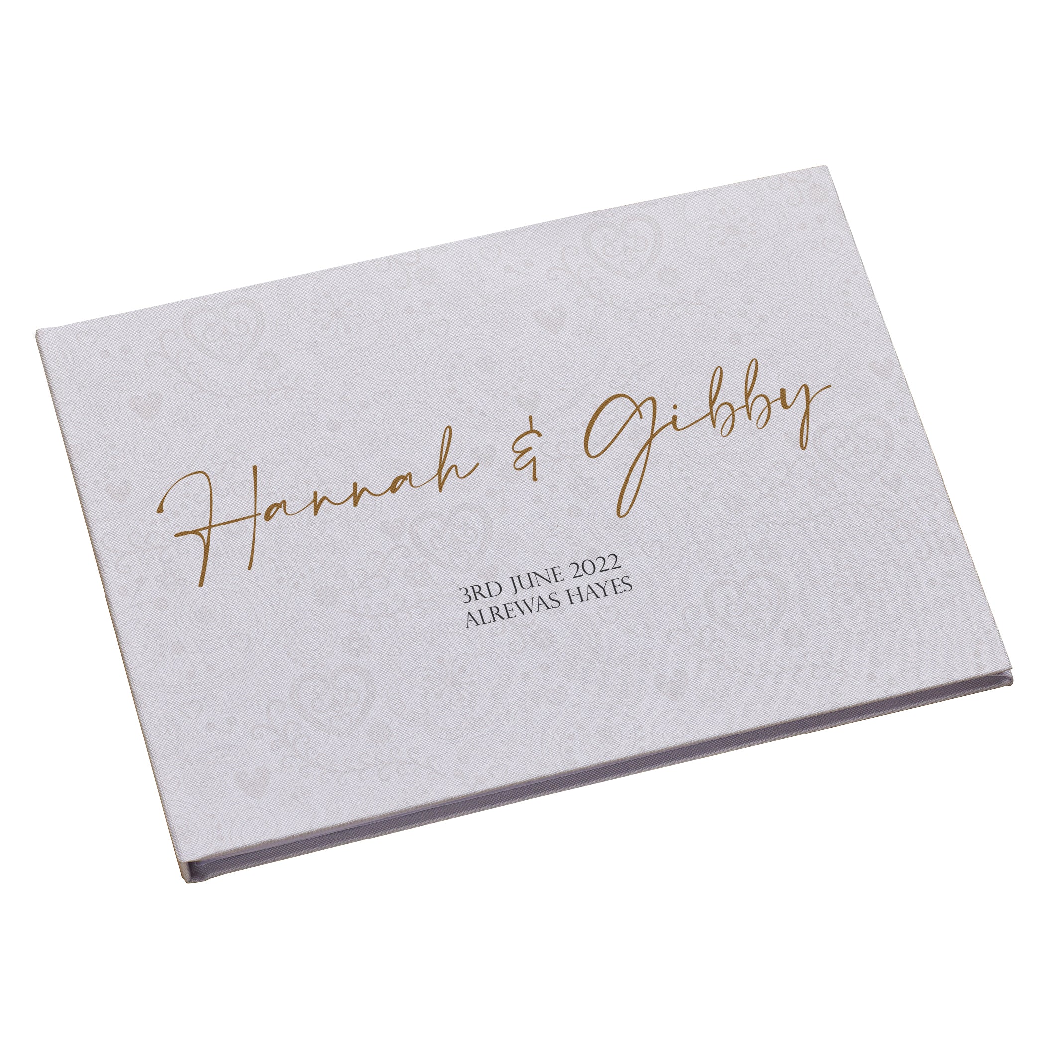 A stunning luxury guest book in white colour with Lined Hard Cover. This can be used for lots of uses as well as guest books. Inside the book has 80 blank pages. An elegant, luxurious keepsake for special occasions, this book offers pages of high-quality, lined paper designed for displaying photos, signatures and more. Enjoy this exquisite linen cover book for displaying your personalised memories in style. Expertly designed for your special day, our Large Personalised Wedding Guest Book Keepsakes offers a sophisticated touch to your wedding. Featuring 80 lined pages with a modern printed design, this signature scrapbook and photo album will be a treasured keepsake for years to come. Personalised with the names of the wedding couple on a beautiful floral background, this guest book is the perfect addition to your wedding day.