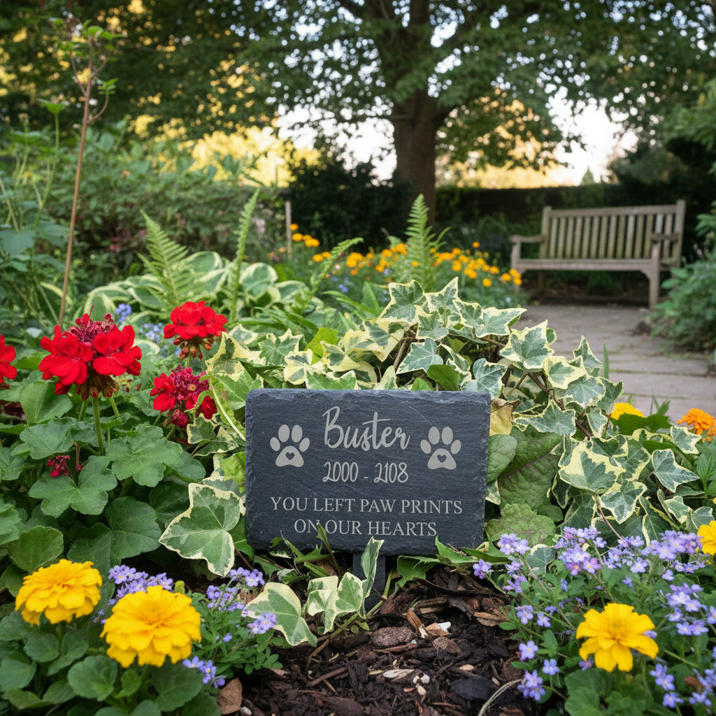 Honour your beloved canine companion with this dignified Memorial Plaque For Pet Dog, a personalised slate grave stone marker designed to create a lasting tribute in your garden or pet cemetery. Crafted from natural slate, each plaque measures 15cm x 10cm with a 20cm stake for secure ground installation, providing a sturdy and weather-resistant memorial. The slate material develops a distinguished patina over time, adding to its timeless character. Your pet's name and cherished dates can be personalised onto the surface, creating a unique keepsake that celebrates the bond you shared. Because each piece of slate is naturally unique, subtle variations in surface texture and edge characteristics ensure your memorial is truly one-of-a-kind. This authentic quality reflects the individual nature of your pet's memory. The plaque's elegant simplicity makes it suitable for any garden setting, whether placed at a pet's resting place or as a reflective memorial space. A respectful and enduring way to remember a faithful friend and the joy they brought to your life.