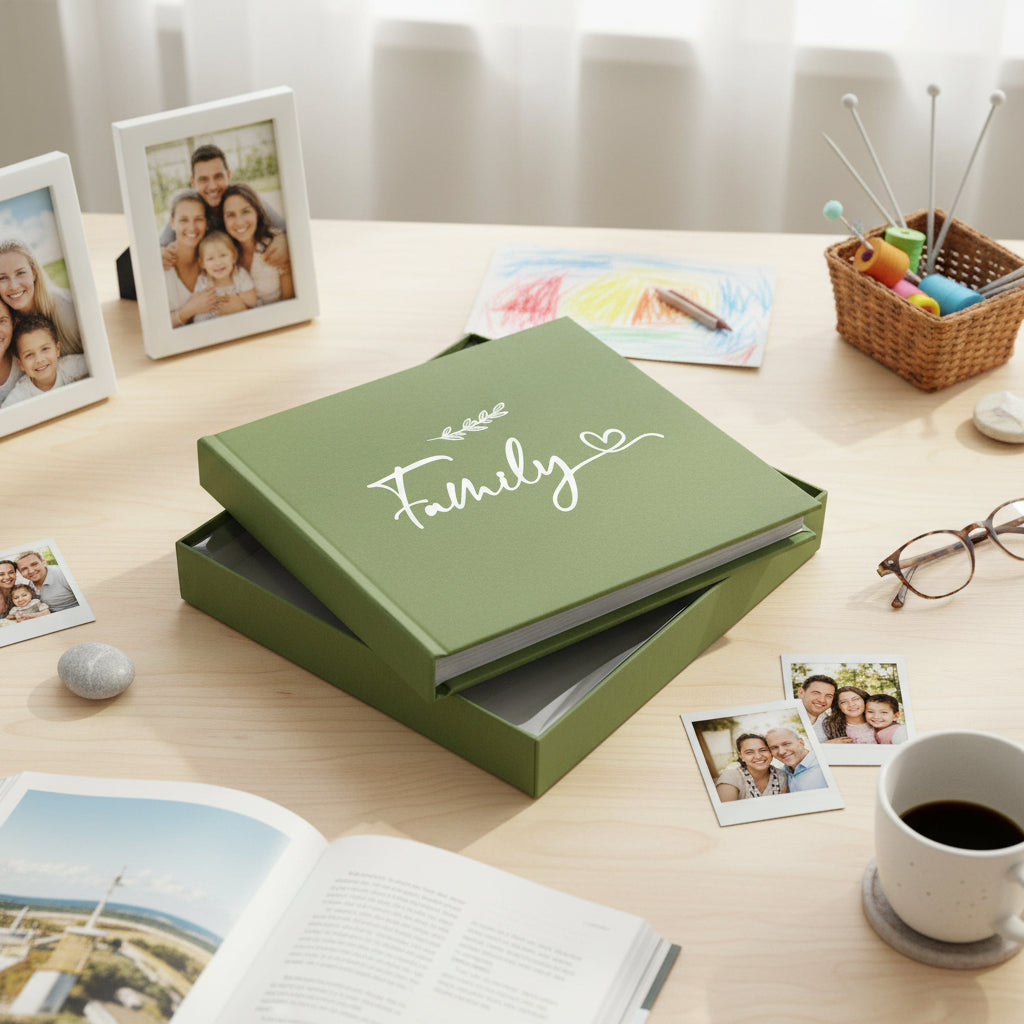 Curate your most treasured family moments in this sophisticated olive green photo album, a timeless vessel for preserving memories across generations. Designed with both aesthetic refinement and practical functionality, this album honours the importance of tangible, physical records in an increasingly digital age. The album accommodates 50 standard 4" x 6" photographs, providing substantial capacity for comprehensive family documentation without overwhelming the viewer. The accompanying leaf design motif adds understated elegance, complementing rather than competing with your photographs whilst elevating the album's visual presence. Thoughtful design features enhance its utility. Dedicated writing spaces adjacent to each photograph allow you to document context—dates, locations, names, or personal reflections—transforming the album into a narrative archive rather than a mere visual collection. This annotation capability proves invaluable for future generations seeking to understand family history and connections. At approximately 18.5cm x 19.5cm, the album achieves optimal proportions. It's substantial enough to command respect as a proper keepsake, yet compact enough for convenient storage on shelves, coffee tables, or display cabinets. The manageable size encourages regular browsing and sharing, ensuring your memories remain accessible and cherished rather than relegated to storage boxes. Premium presentation arrives as standard. The album comes beautifully boxed, eliminating the need for additional gift wrapping and signalling the thoughtfulness of your gesture. Whether preserving your own family legacy or gifting to relatives, this olive green album serves as a meaningful investment in memory preservation and family connection.